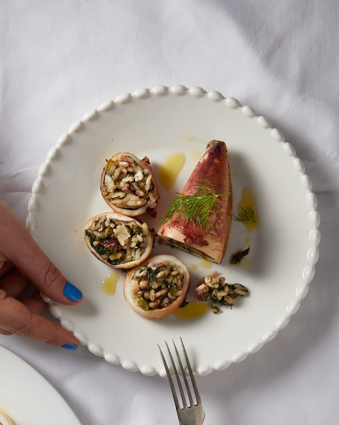 - Γεμίζουμε τους κορμούς των καλαμαριών με το μείγμα της κατσαρόλας, όχι μέχρι πάνω, για να μη σκάσουν στο ψήσιμο. Κλείνουμε το άνοιγμα με οδοντογλυφίδες.
