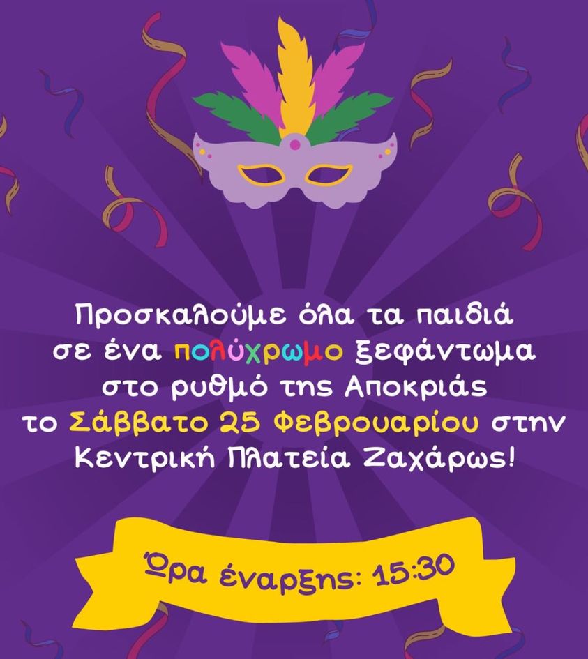 Ζαχάρω: Παιδικό αποκριάτικο πάρτι Σάββατο 25 Φεβρουαρίου & ώρα 15:30