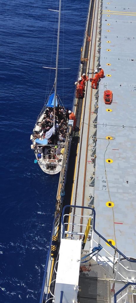 Διευκρινίζεται ότι το ιστιοφόρο εντοπίστηκε αρχικά από το πλοίο «ZIM CHINA», σημαίας Λιβερίας, και από εναέριο εκπαιδευτικό μέσο της Πολεμικής Αεροπορίας, και ακολούθως από ελικόπτερο της Πολεμικής Αεροπορίας. Στη συνέχεια, άλλο παραπλέον πλοίο προσέδεσε παραπλεύρως το ιστιοφόρο προς ασφάλισή του και εξακρίβωση για άτομα με τυχόν ανάγκη ιατρικής περίθαλψης αλλά και παροχής νερού. Σημειώνεται ότι η αρχική πληροφορία, ότι το ιστιοφόρο είχε εισροή υδάτων και ότι ήταν σε κίνδυνο, δεν επιβεβαιώθηκε από τις Λιμενικές Αρχές.