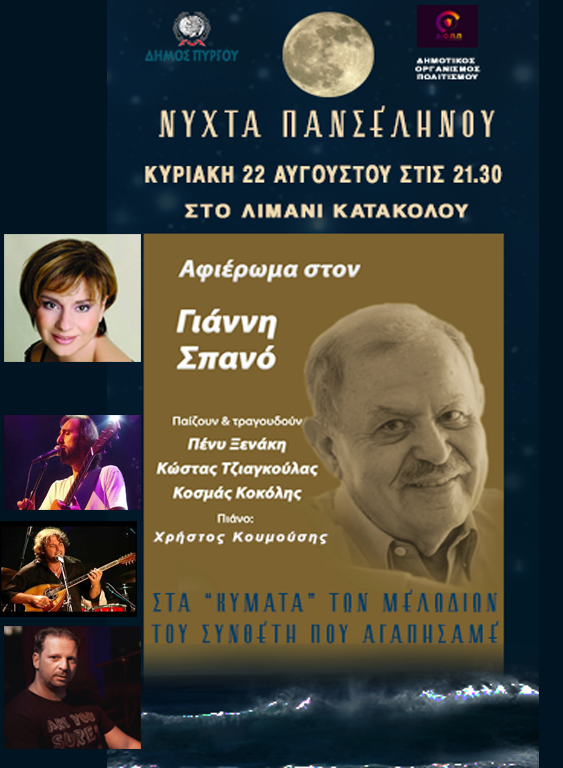 Κάτω από το Αυγουστιάτικο φεγγάρι στην μαρίνα Κατακόλου οι μελωδίες του Γιάννη Σπανού που δεν είναι πια κοντά μας, θα πλημμυρίσουν τον χώρο από τους ανθρώπους που ήταν όμως πάντα κοντά του.