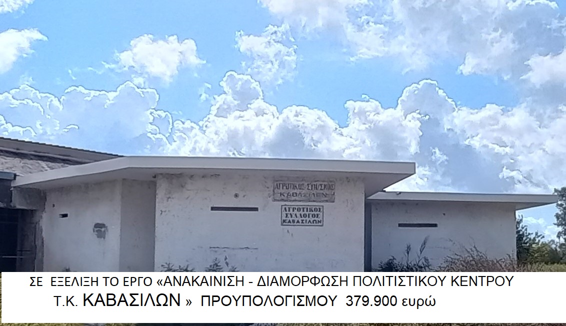 Σε εξέλιξη βρίσκεται το έργο «ΑΝΑΚΑΙΝΙΣΗ – ΔΙΑΜΟΡΦΩΣΗ ΠΟΛΙΤΙΣΤΙΚΟΥ ΚΕΝΤΡΟΥ Τ.Κ. ΚΑΒΑΣΙΛΩΝ » προϋπολογισμού 379.900 ευρώ ύστερα από χρηματοδότηση που εξασφάλισαν ο Δήμαρχος Πηνειού κ. Ανδρέας Μαρίνος και η Δημοτική Αρχή .