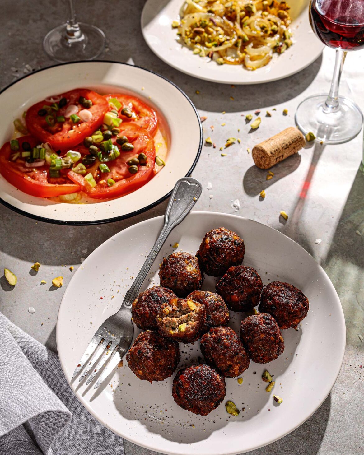 - Για τα κεφτεδάκια με φυστίκια Αιγίνης και ανατολίτικα μπαχαρικά, σε μεγάλο μπολ ζυμώνουμε καλά όλα τα υλικά, εκτός φυσικά από το λάδι για το τηγάνισμα.