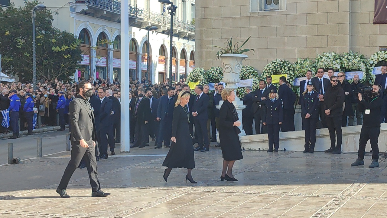 Σήκωσε το χέρι της και διακριτικά χαιρέτησε τους παρευρισκόμενους οι οποίοι την επευφημούσαν όταν έφτασε στη Μητρόπολη Αθηνών.