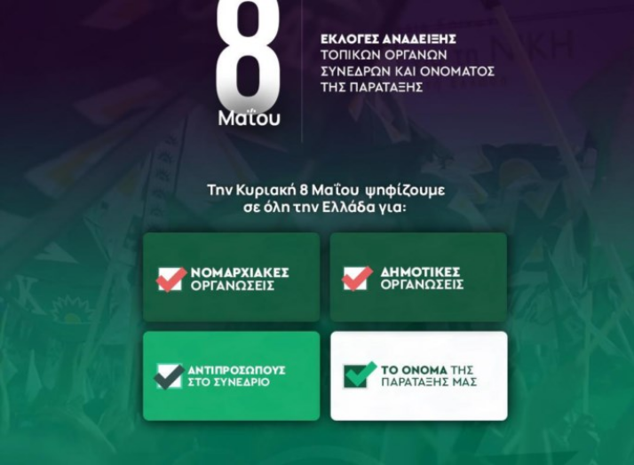 Η ψηφοφορία για την εκλογή των 4.200 συνέδρων και την ανάδειξη των νέων οργάνων στις Ν.Ο. και Τ.Ο. (Νομαρχιακές Επιτροπές, Ν.Ε., και συντονιστικές επιτροπές, Σ.Ε., αντίστοιχα) θα πραγματοποιηθεί την Κυριακή 8 Μαΐου 2022 και ώρες 07:00 – 19:00.
