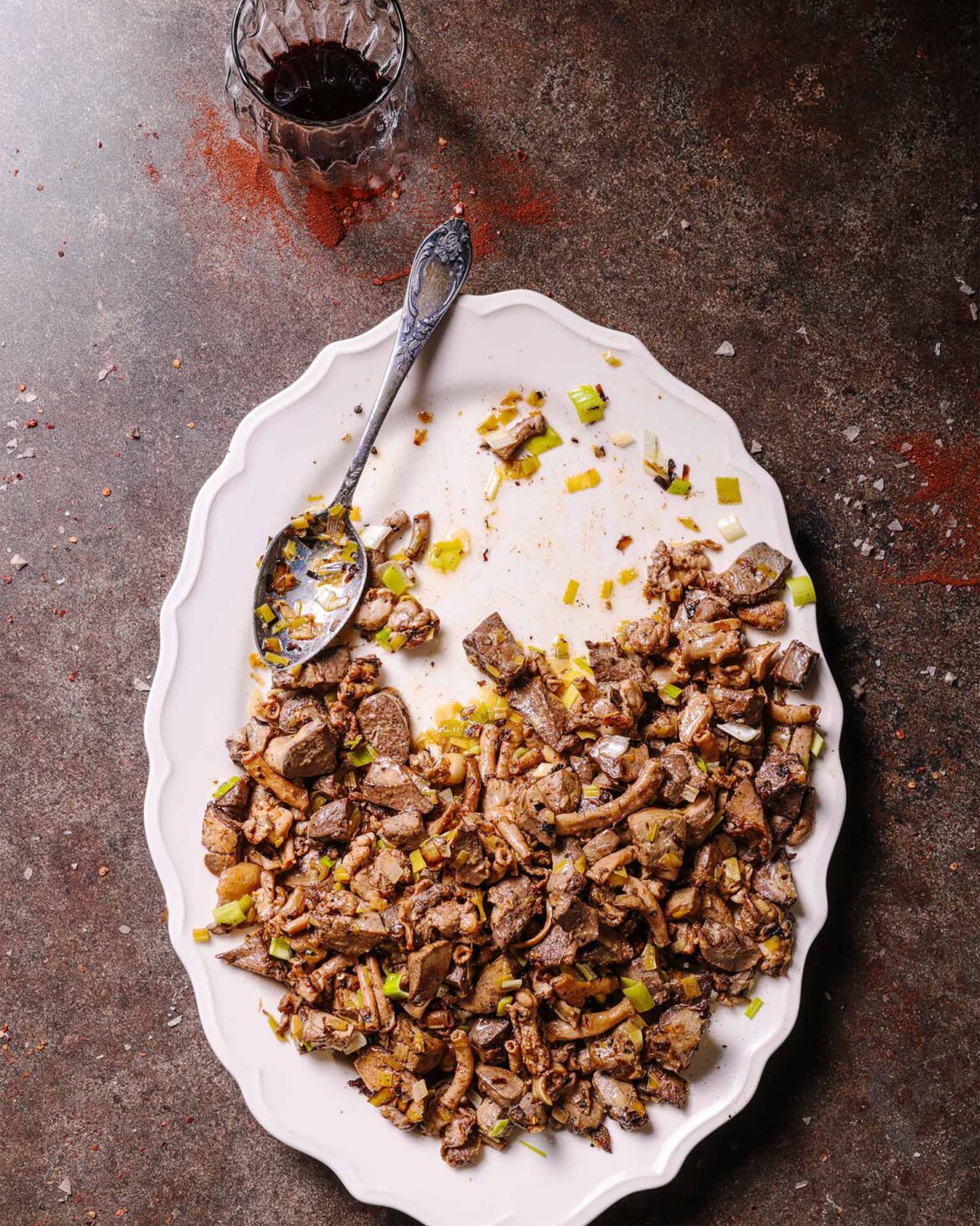 - Για το κοκορέτσι «λυμένο» στο τηγάνι, με πράσα, ξεκινάμε ψιλοκόβοντας τη συκωταριά και την αντεριά σε κομμάτια του 1 εκ.