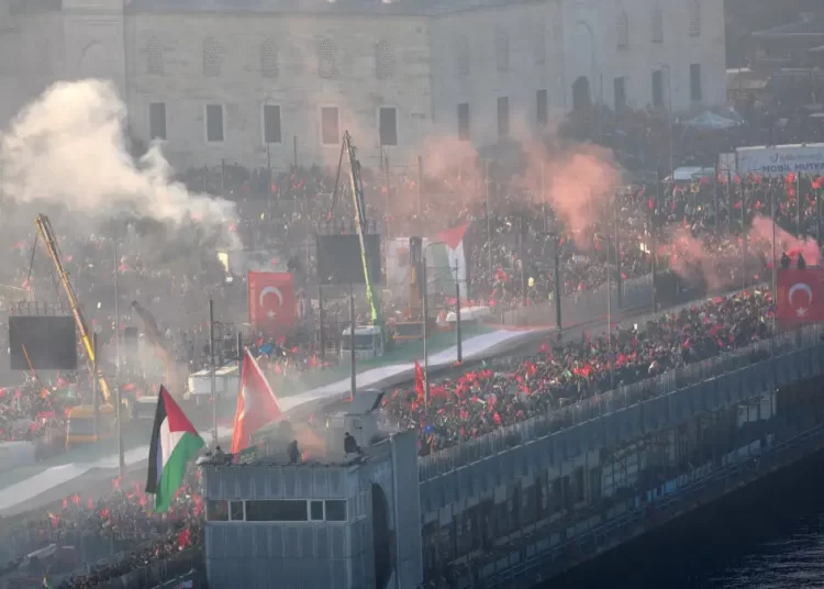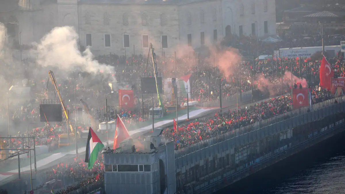 Οι διαδηλωτές κρατώντας σημαίες της Παλαιστίνης και της Τουρκίας μετά την πρωινή προσευχή κατευθύνθηκαν προς τη γέφυρα του Γαλατά.
