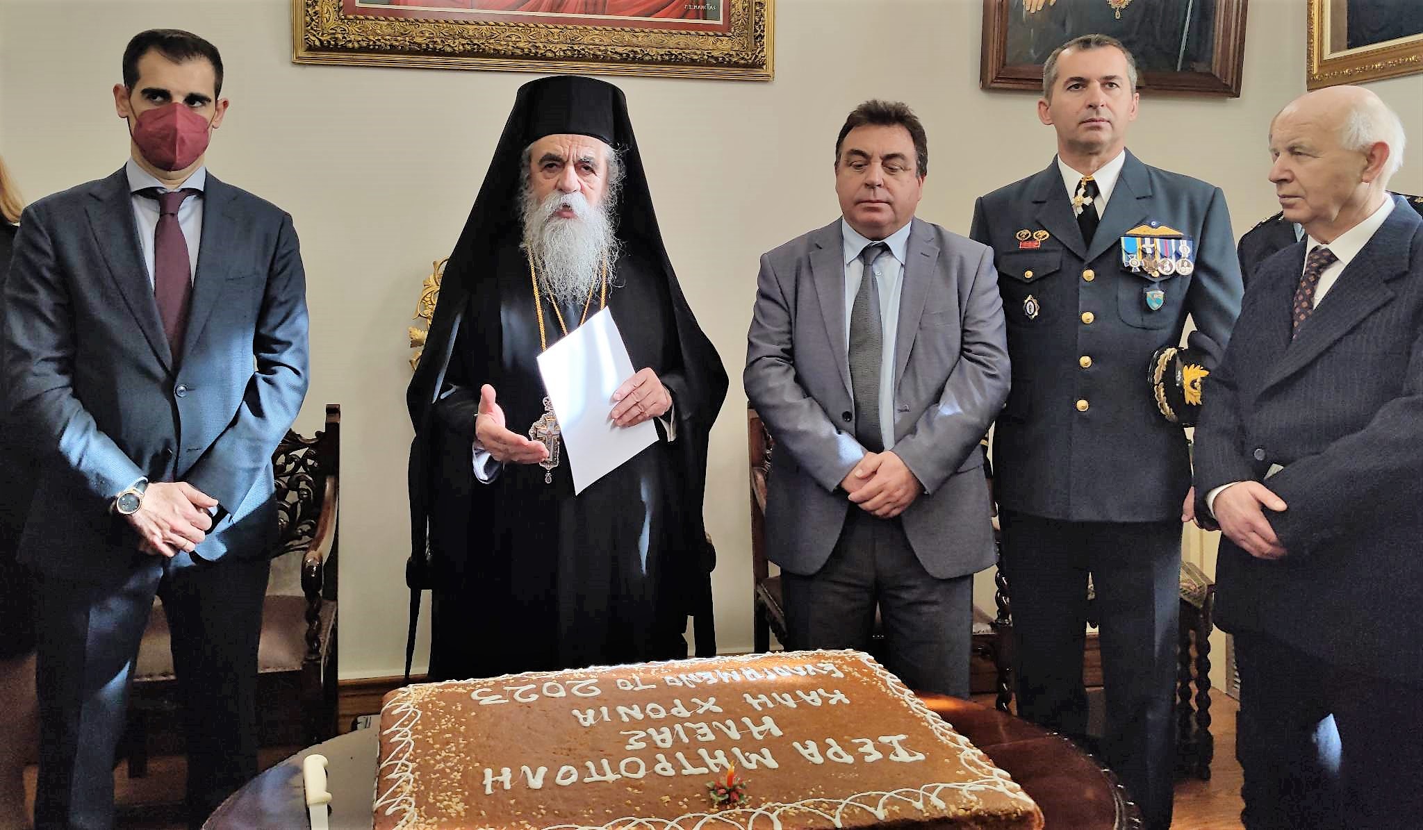 Στο Μητροπολιτικό Μέγαρο Πύργου, για πρώτη φορά ως Μητροπολίτης Ηλείας και Ωλένης, παρουσία του Ιερού Κλήρου, των Πολιτικών, Πολιτειακών, Στρατιωτικών Αρχών και των Σωμάτων Ασφαλείας, καθώς επίσης εκπροσώπων κοινωνικών Συλλόγων και πνευματικών φορέων, συνεργατών της τοπικής μας Εκκλησίας, αλλά και πλήθους κόσμου, αφού ευχήθηκε πατρικά τα δέοντα για τον νέο ενιαυτό της χρηστότητος του Κυρίου, παρουσιάζοντας παράλληλα τον Κοινωνικό και Οικονομικό απολογισμό της Ιεράς Μητροπόλεως για το απερχόμενο έτος 2022, ευλόγησε κατά το έθος και μοίρασε την Αγιοβασιλόπιτα, ευχόμενος στον καθένα ξεχωριστά καλή και ευλογημένη χρονιά.