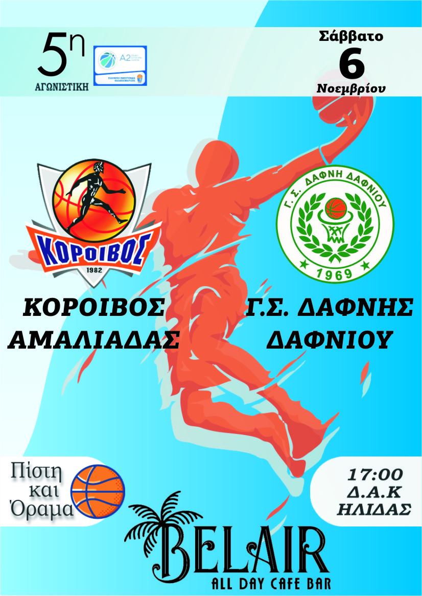 Ο Κόροιβος Αμαλιάδας το απόγευμα του Σαββάτου αντιμετώπισε στο Κλειστό Ήλιδας τη Δάφνη Δαφνίου, και επικράτησε άνετα με το συντριπτικό 98-50 σκορ, στο πλαίσιο της 5ης αγωνιστικής του πρωταθλήματος μπάσκετ της Α2 Εθνικής.