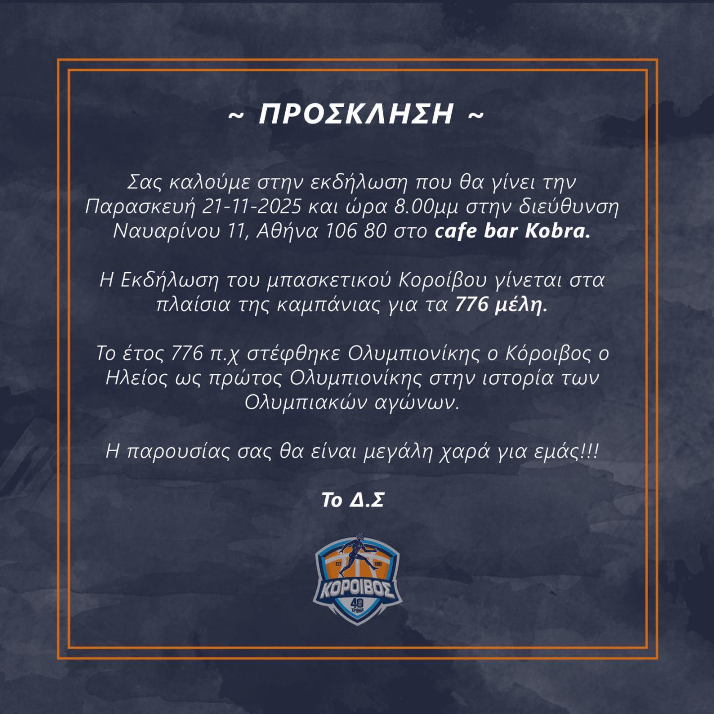 “Την Παρασκευή στις 20:00, θα έχω την τιμή να βρίσκομαι στην εκδήλωση του μπασκετικού Κόροιβου – Koroivos BC / ΑΣΑ Κόροιβος, στο Cafe Bar Kobra στην Αθήνα, στηρίζοντας μια πρωτοβουλία που αγγίζει βαθιά την καρδιά κάθε Ηλείου: τη μεγάλη καμπάνια για τα 776 μέλη.