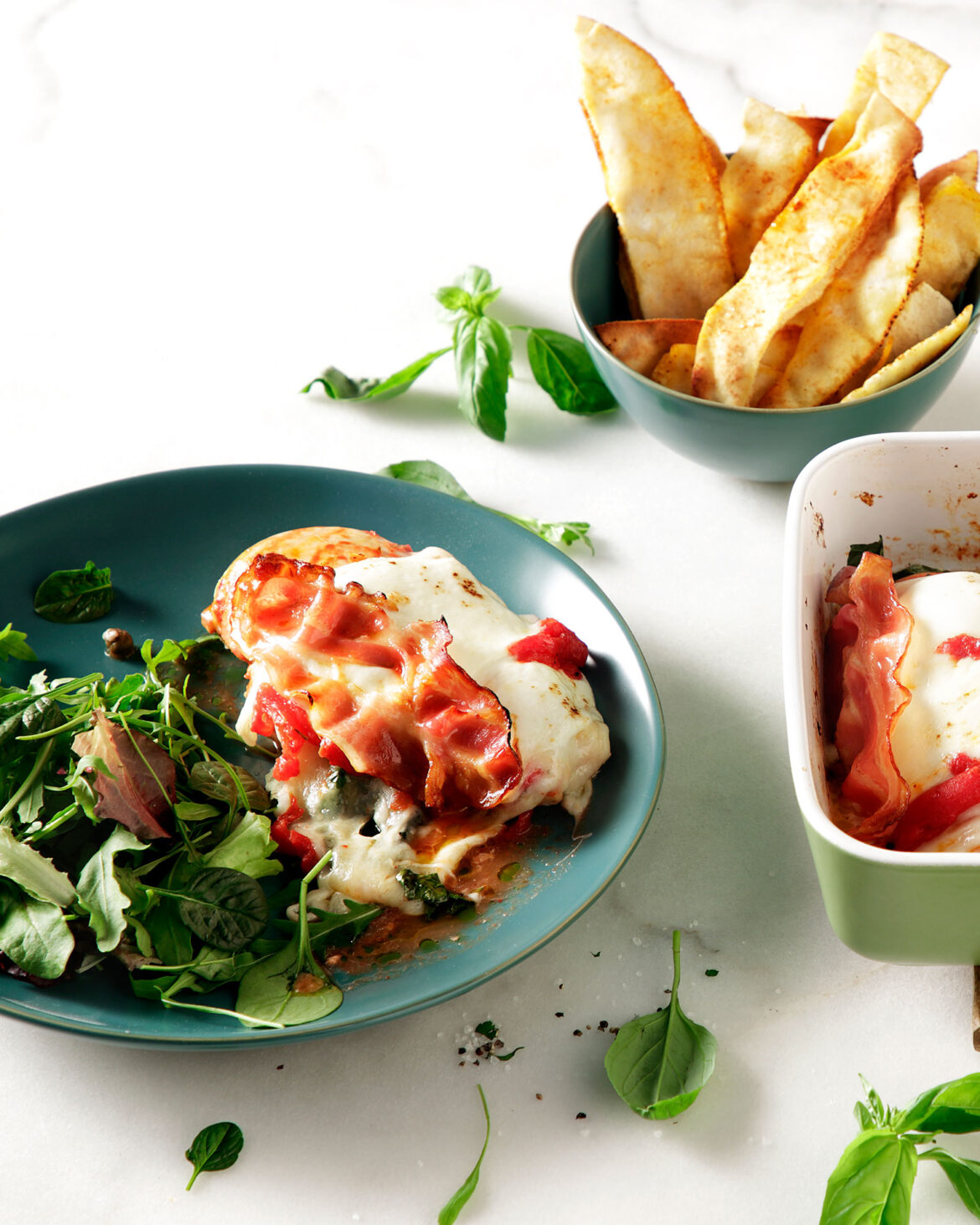 - Ξεφουρνίζουμε το κοτόπουλο φιλέτο ψημένο σαν πίτσα, σκορπίζουμε τον βασιλικό και τον μαϊντανό και σερβίρουμε.
