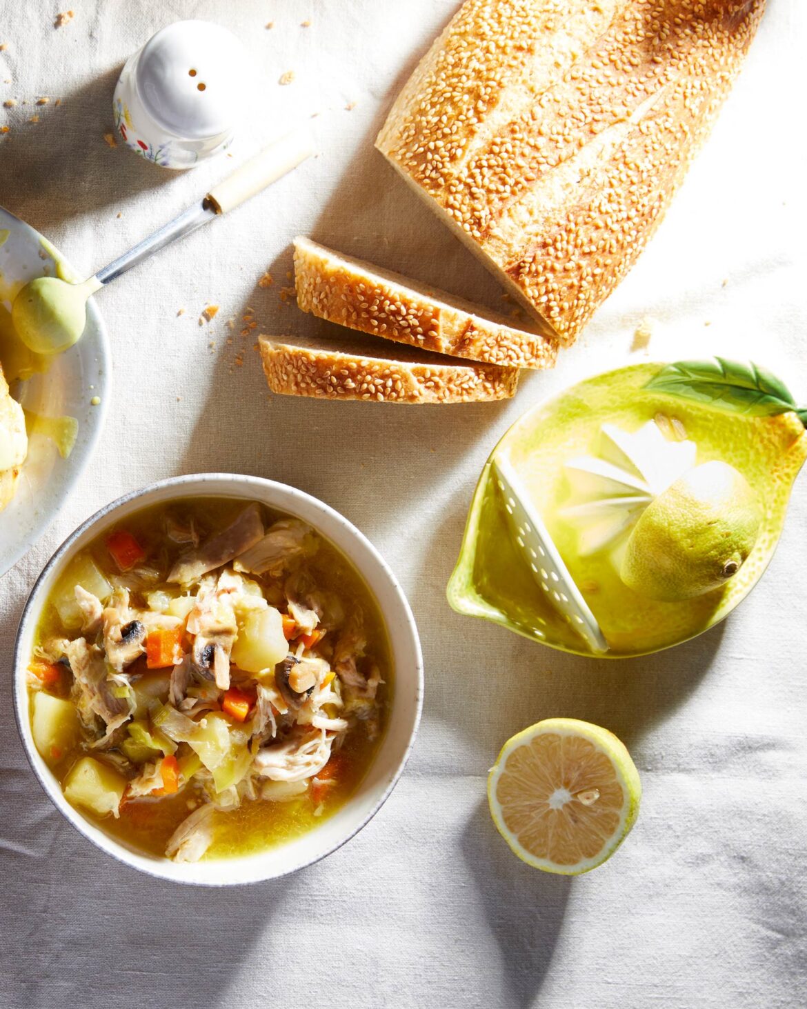 - Προσθέτουμε το κοτόπουλο, το δεντρολίβανο, τον λεμονοχυμό, αλατοπίπερο και βράζουμε όλα τα υλικά μαζί για άλλα 5 λεπτά, μέχρι να χυλώσει η σούπα.