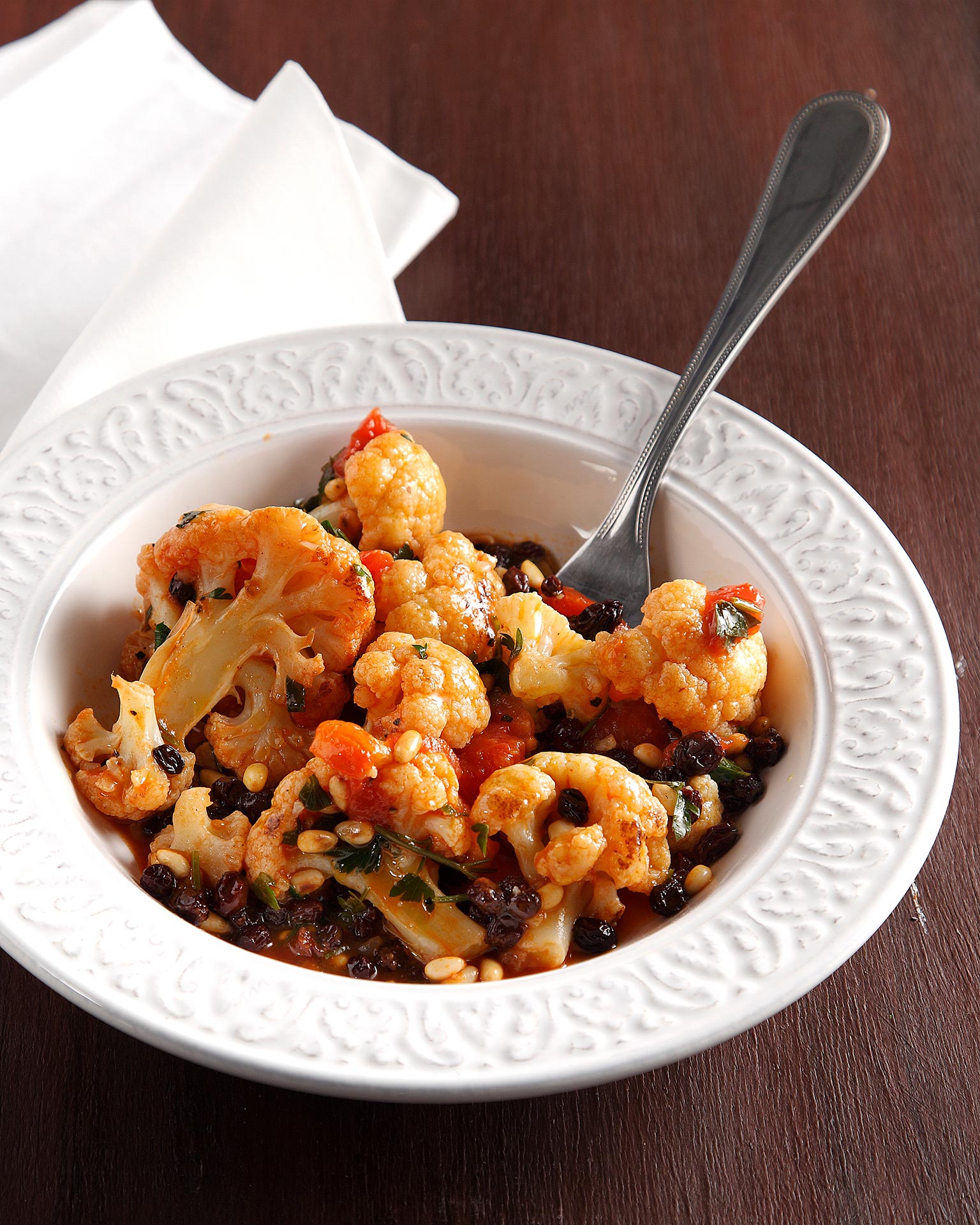 - Σκορπίζουμε το μαϊντανό, αποσύρουμε, αφήνουμε το κουνουπίδι γιαχνί με σταφίδες για περίπου 10 λεπτά να «σταθεί» και σερβίρουμε.