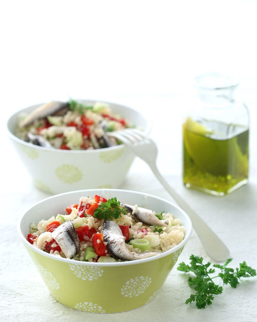 - Για το κουσκούς με γαύρο μαρινάτο και πιπεριά από βάζο ξεκινάμε και μουλιάζουμε 250 γρ. κουσκούς σε βραστό νερό σύμφωνα με τις οδηγίες, σουρώνουμε και αλατίζουμε.