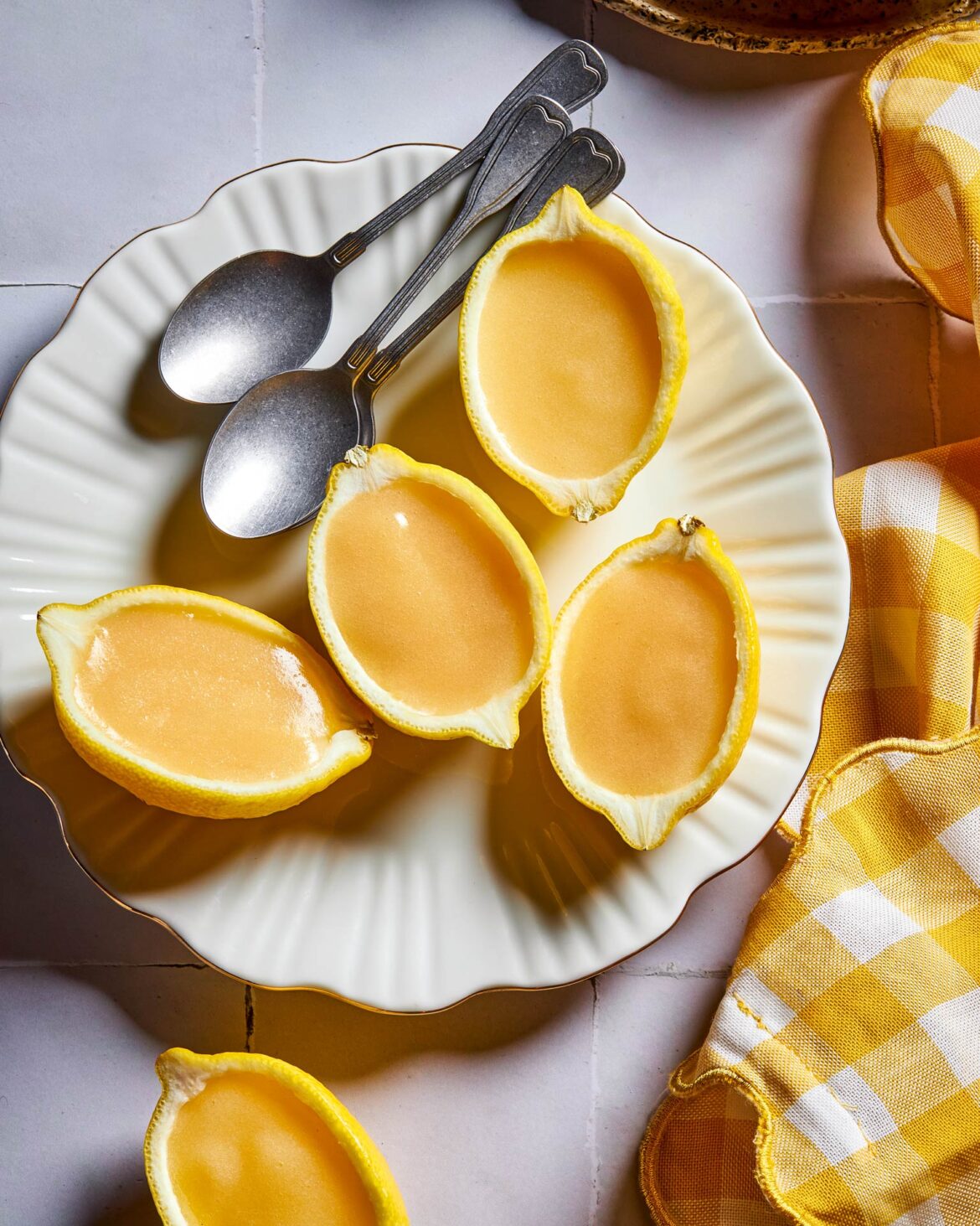- Μοιράζουμε την κρέμα στις λεμονόκουπες (ή σε 6 μικρά μπολάκια) και ισιώνουμε την επιφάνεια.