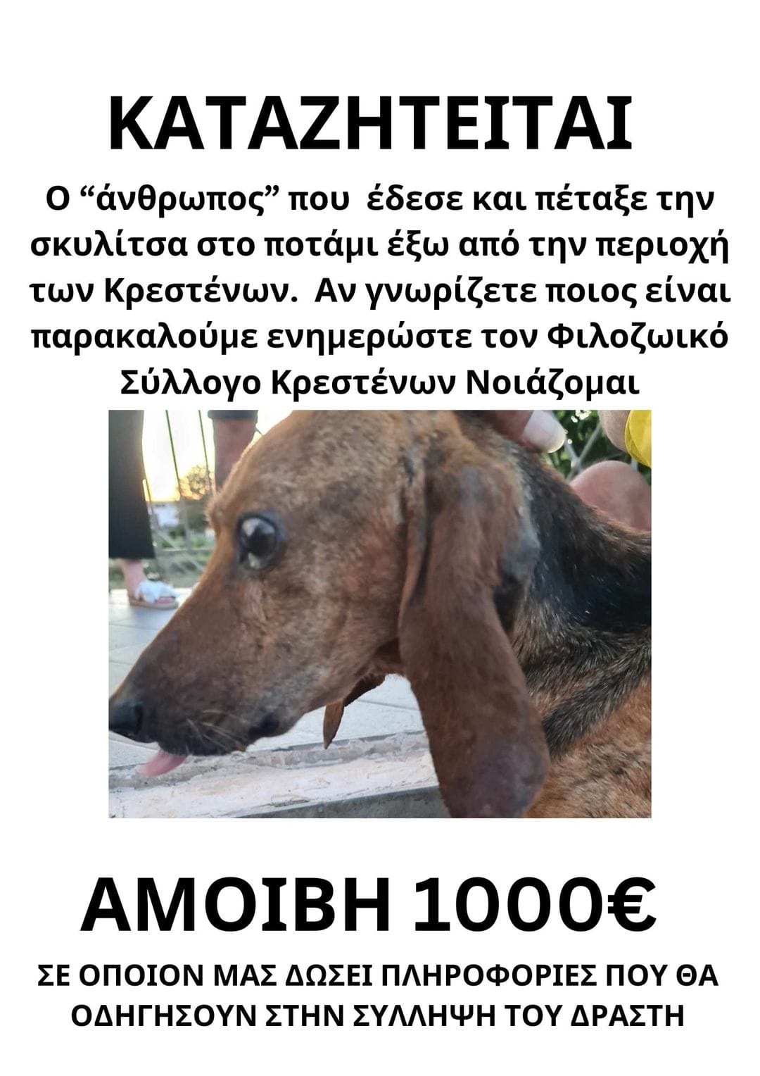 Αμοιβή 1000 ευρώ δίνει ο Φιλοζωϊκός Σύλλογος Κρεστένων σε όποιον δώσει πληροφορίες για να εντοπιστεί ο δράστης που έδεσε και πέταξε στο ποτάμι την τυφλή σκυλίτσα. Αυτή η πράξη προ ημερών έφερε μεγάλη αναστάτωση σε όλους καθώς τέτοιες πράξεις είναι βάρβαρες και καταδικαστέες και νομικά!