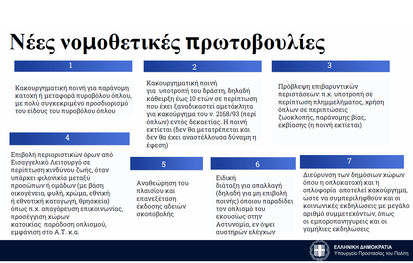 Σε σχέση με την οπλοκατοχή, ο κ. Χρυσοχοΐδης ανέφερε ότι θα υπάρξει αυστηροποίηση ποινών σε συγκεκριμένα αδικήματα που ήδη περιγράφονται στον νόμο.