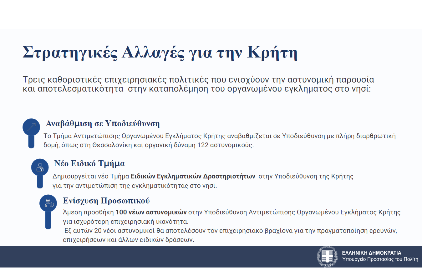 Θα συσταθεί υποδιεύθυνση του ελληνικού FBI στην Κρήτη και θα στελεχωθεί με 122 αστυνομικούς, με «στόχο την αντιμετώπιση των ιδιαίτερων μορφών εγκληματικότητας του νησιού», που αφορά εγκλήματα κατά της ζωής, παράνομης διακίνησης και χρήσης όπλων, εκβιάσεων, ληστειών – κλοπών – ζωοκλοπών και αγροζημιών.