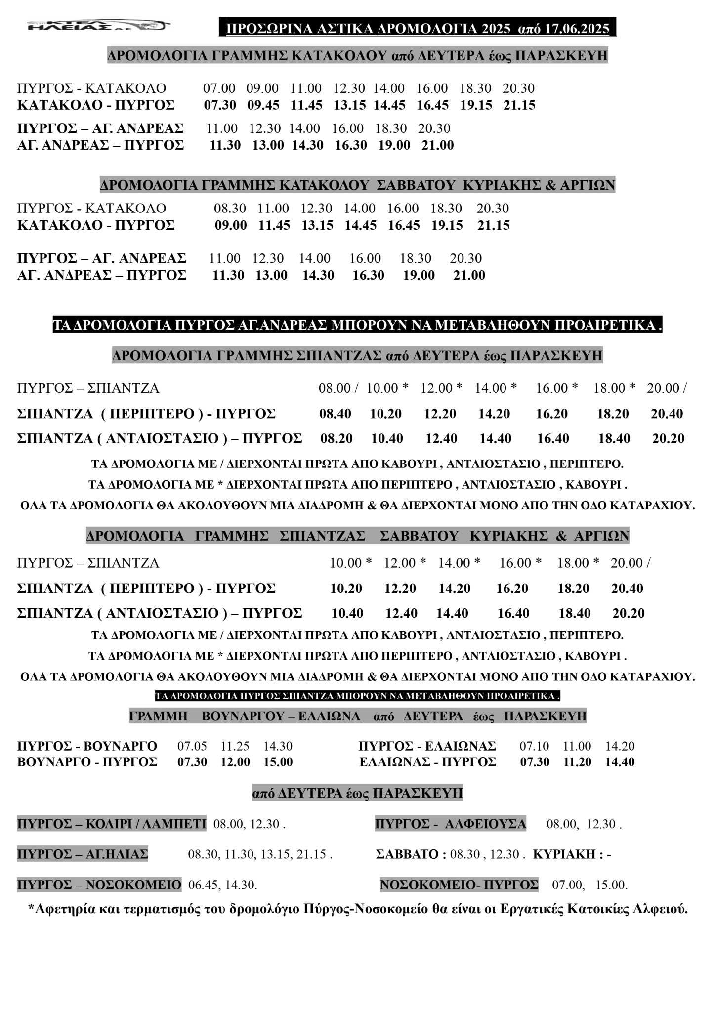 ΚΤΕΛ Ν.Ηλείας: Τα νέα θερινά δρομολόγια αστικών γραμμών Πύργου – Για Σπιάντζα, Κατάκολο, Αγ. Ανδρέα, κ.τ.λ.