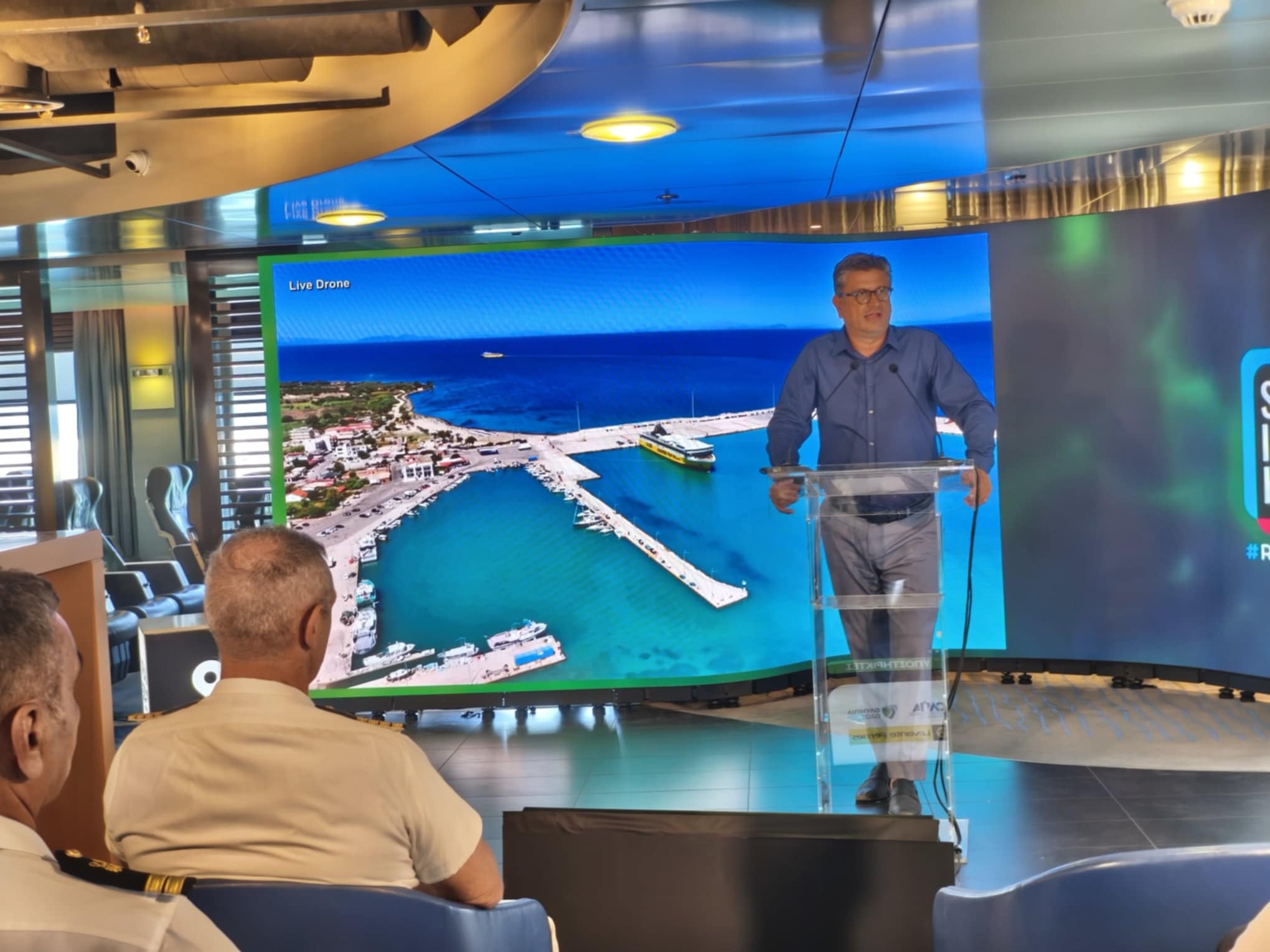 μοντέλο βιώσιμης ανάπτυξης παράκτιων και νησιωτικών κοινοτήτων, με τη συμμετοχή του Αντιπρόεδρου Κλάδου Ενέργειας της ΡΑΑΕΥ Δημήτριου Φούρλαρη, του Διευθυντή Διεύθυνσης Συντονισμού, Ενημέρωσης Διοίκησης & Μετοχών της Δ.Ε.Δ.Δ.Η.Ε. Α.Ε. Ορέστη Τόγια, του CEO της Levante Ferries Στρατή Απέργη και Διευθύνοντος Σύμβουλου της Sea Ahead Marine Σπύρο Πασχάλη.