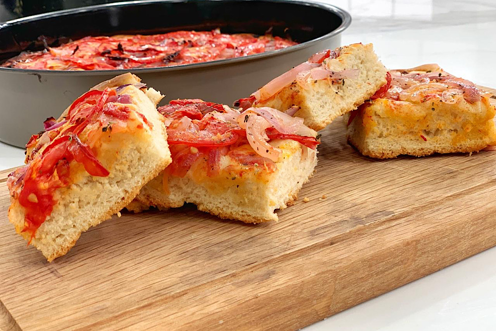 Αφήνετε τη ζύμη να ξεκουραστεί για μισή ώρα και μετά τη βάζετε σε ένα αβαθές ταψάκι το οποίο έχετε αλείψει προηγουμένως με ελαιόλαδο. Την ανοίγετε με τα δάχτυλα μέχρι να καλύψει όλη την επιφάνεια του ταψιού.
