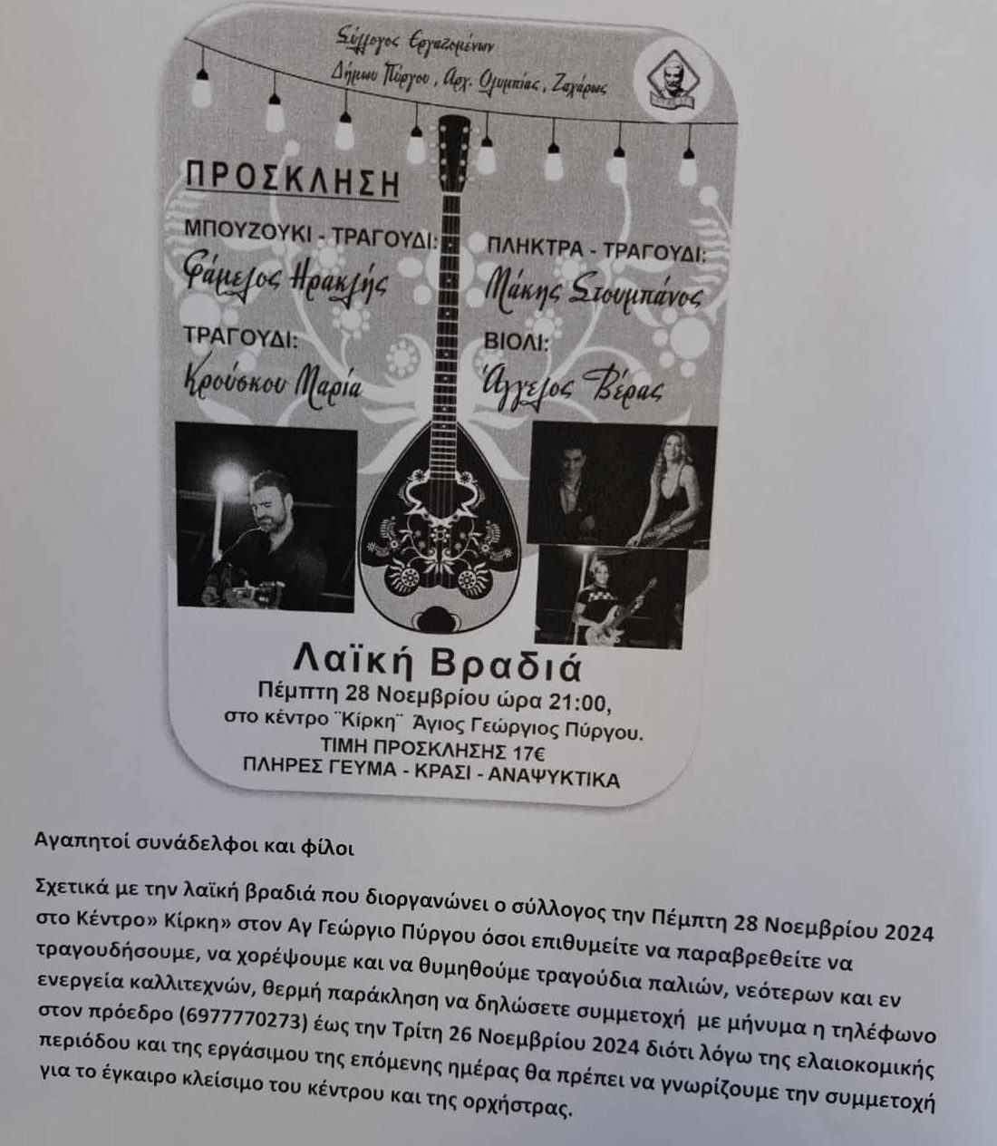 Λαϊκή βραδιά διοργανώνει ο Σύλλογος Εργαζομένων Δήμων Πύργου, Ολυμπίας, Ζαχάρως