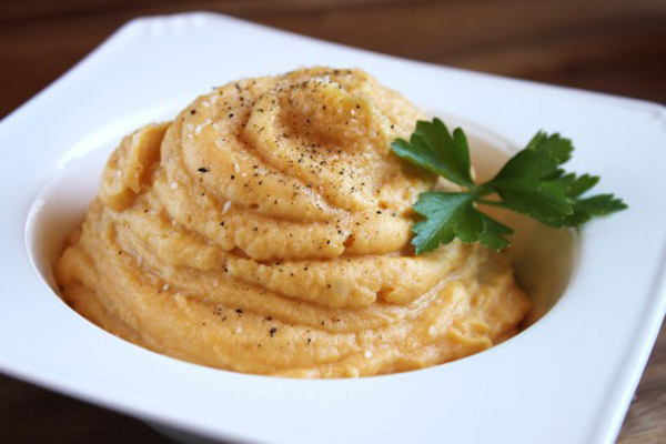 Βάζουμε την ψίχα από τις πατάτες σε ένα κατσαρολάκι και σιγά-σιγά προσθέτουμε το έξτρα παρθένο ελαιόλαδο, ενώ ανακατεύουμε. Μόλις αποκτήσει ωραία υφή, προσθέτουμε το ξύσμα από δύο λεμόνια και τον χυμό μισού λεμονιού, το φρέσκο θυμάρι, φρέσκο πιπέρι και τον πολτό από το σκόρδο.