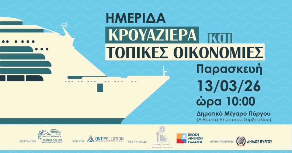 Με στόχο την ανάδειξη της κρουαζιέρας ως σημαντικού μοχλού οικονομικής και κοινωνικής ανάπτυξης, το Δημοτικό Λιμενικό Ταμείο Πύργου με την υποστήριξη του Δήμου Πύργου και υπό την αιγίδα του Υπουργείου Ναυτιλίας και Νησιωτικής Πολιτικής και της Ένωσης Λιμένων Ελλάδας, διοργανώνει την Παρασκευή 13 Μαρτίου 2026 στις 10.00 π.μ. ημερίδα με θέμα «Κρουαζιέρα και Τοπικές Οικονομίες», στην Αίθουσα Δημοτικού Συμβουλίου του Δημοτικού Μεγάρου Πύργου.