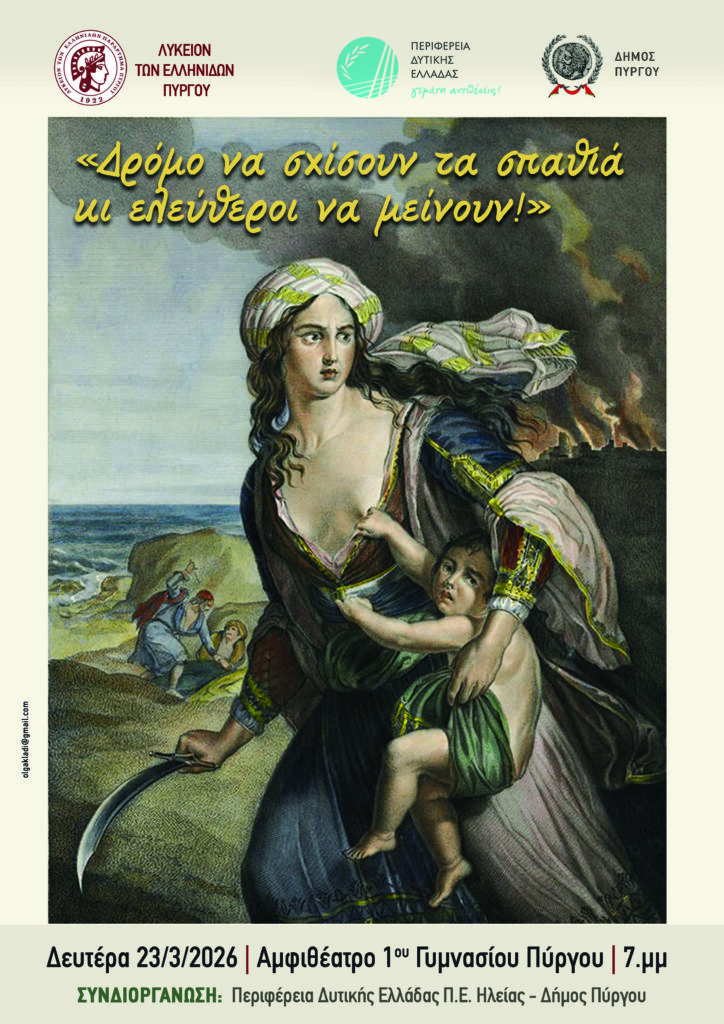 Δευτέρα 23 Μαρτίου 2026 στο αμφιθέατρο του 1ου Γυμνασίου Πύργου, ώρα 7.00 μ.μ.