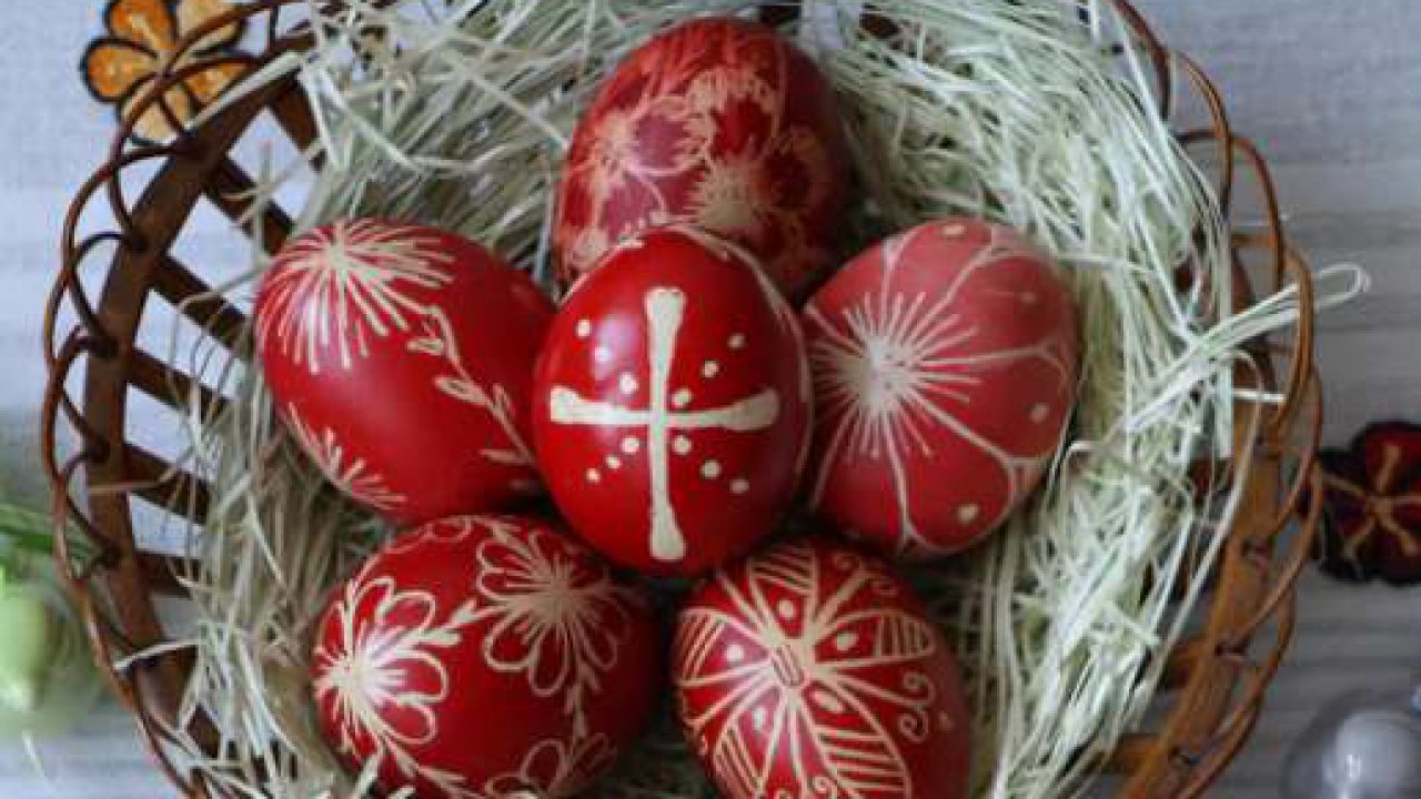 Τα «κόκκινα» αυγά: Σε μια ευρύχωρη κατσαρόλα τοποθετούμε τα κρεμμυδόφυλλα, τα περιχύνουμε με 2 φλιτζάνια καυτό νερό και αφήνουμε στην άκρη για 2-3 ώρες. Τοποθετούμε τα αυγά επάνω στα κρεμμυδόφυλλα και σε ένα μπολ αναμειγνύουμε το ξίδι με όσο νερό χρειάζεται για να καλυφθούν τα αυγά και το προσθέτουμε στην κατσαρόλα προσεκτικά. Βάζουμε σε χαμηλή φωτιά τα αυγά να βράσουν για 12-15’ μετά την πρώτη βράση, αποσύρουμε και αφήνουμε τα αυγά να κρυώσουν.