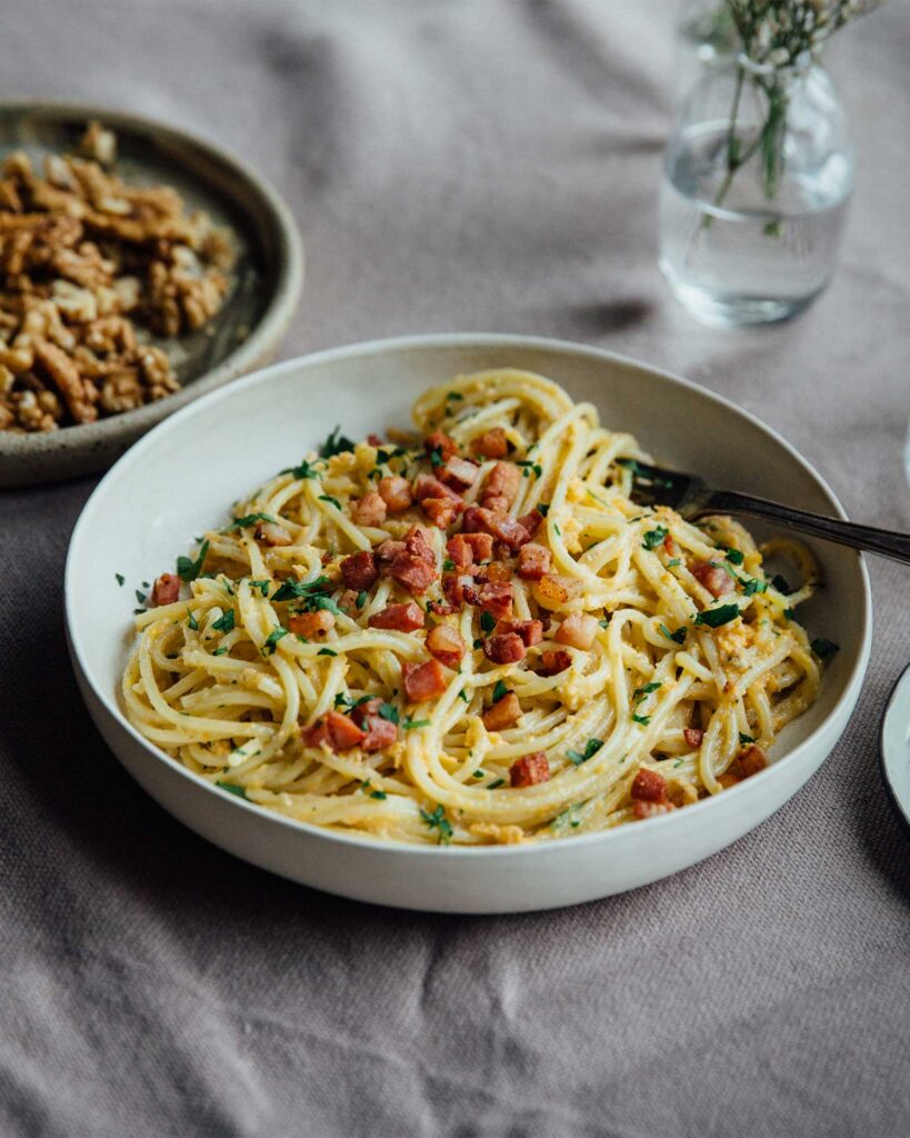 - Μοιράζουμε τη μακαρονάδα στα πιάτα, σκορπίζουμε λίγο μπέικον και καρυδόψιχα και σερβίρουμε.