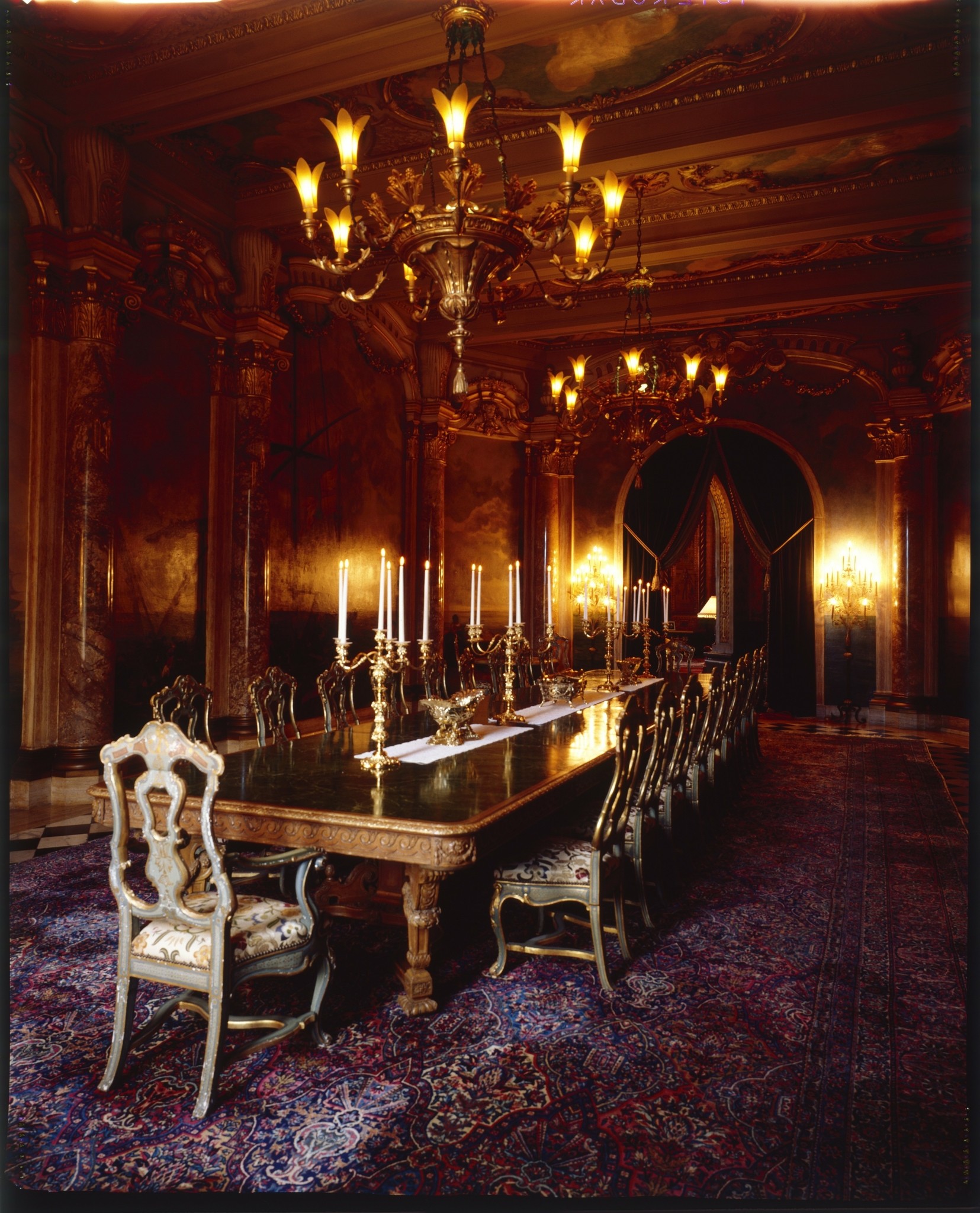 Το αυθεντικό οικόσημο της έπαυλης που χρησιμοποιήθηκε από την οικογένεια της Marjorie Merriweather Post έφερε τη λατινική λέξη “Veritas”, που σημαίνει “αλήθεια”. Όταν ο Trump ανέλαβε την ιδιοκτησία, διατήρησε το σχέδιο του οικοσήμου αλλά αντικατέστησε τη λέξη “Veritas” με το όνομά του, “Trump”. Το σχέδιο παρέμεινε σχεδόν ίδιο, με ένα χρυσό θυρεό και σύμβολα ευγενικής καταγωγής.