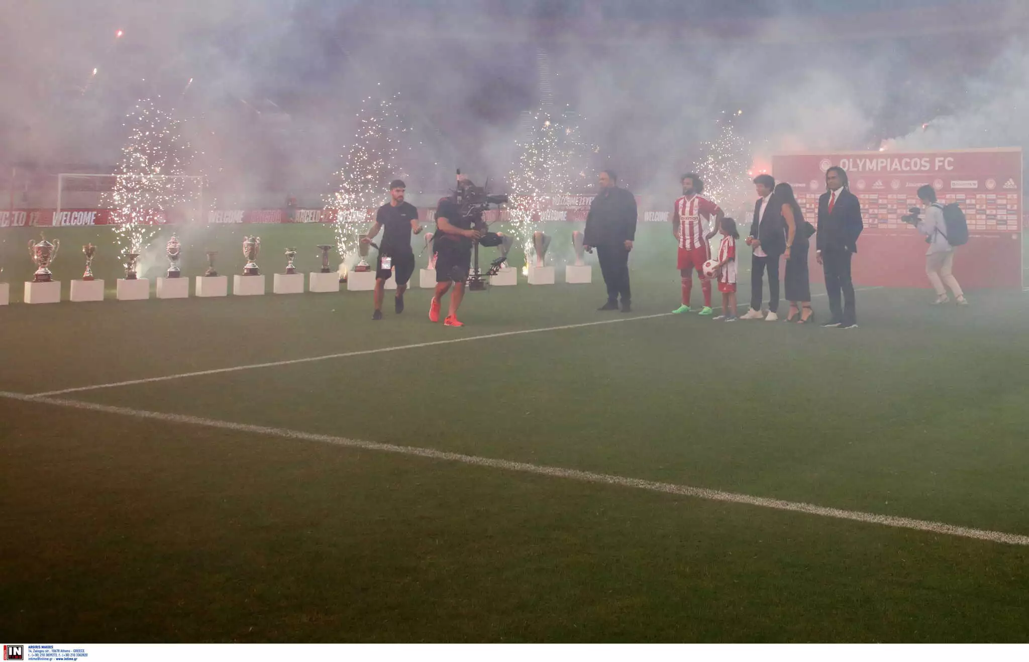 Συνοδεία του Βαγγέλη Μαρινάκη, ο Μαρσέλο μπήκε στον αγωνιστικό χώρο και προχώρησε σε «διάδρομο» από τα τρόπαια του συλλόγου. Λίγο πριν, η «ερυθρόλευκη» ΠΑΕ «έπαιζε» στα matrix του γηπέδου ένα βίντεο από τις μεγαλύτερες στιγμές του Βραζιλιάνου άσου.