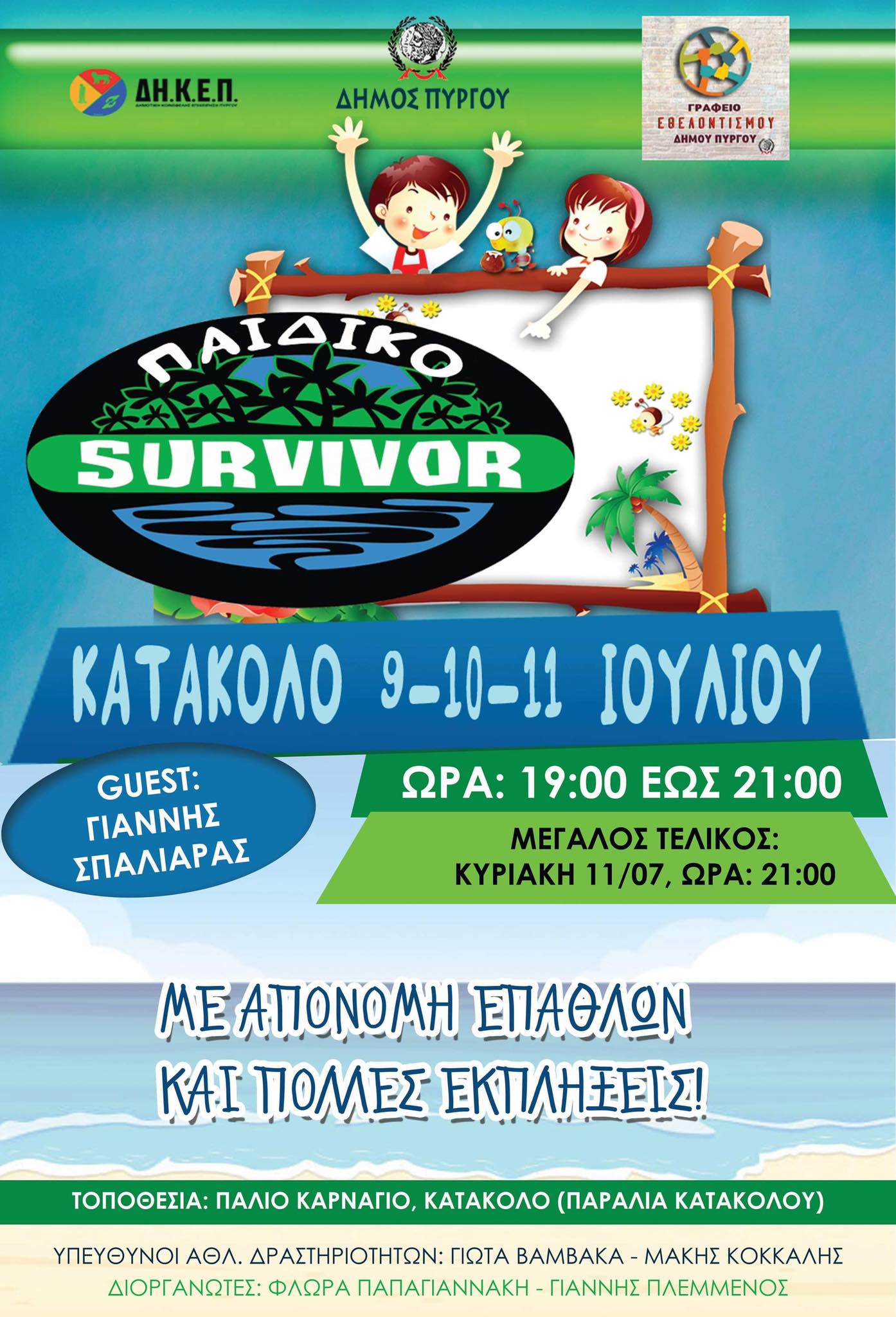 Τις αθλητικές δραστηριότητες έχουν επιλέξει η Γιώτα Βαμβακά και ο Μάκης Κόκκαλης, ενώ την τελευταία ημέρα Κυριακή 11/7 ο γνωστός πρώην παίκτης του Survivor Γιάννης Σπαλιάρας σε ρόλο gest θα βρίσκεται στο Κατάκολο, όπου θα παίξει μαζί με τα παιδιά και θα απονείμει βραβεία.