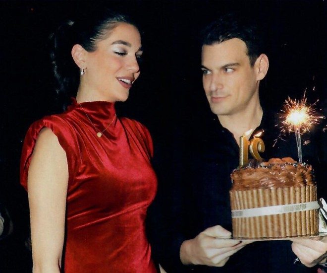 Η 21χρονη κόρη της Δέσποινας Βανδή και του Ντέμη Νικολαΐδη έσβησε τα κεράκια σε δύο τούρτες, μία μέσα στο καμαρίνι της μαμάς της και μία στο τραπέζι όπου καθόταν με την παρέα της. Για τη βραδιά των γενεθλίων της επέλεξε ένα κοντό φόρεμα από βελούδο σε βαθύ κόκκινο χρώμα, λεπτό μαύρο καλσόν και μαύρα πέδιλα.