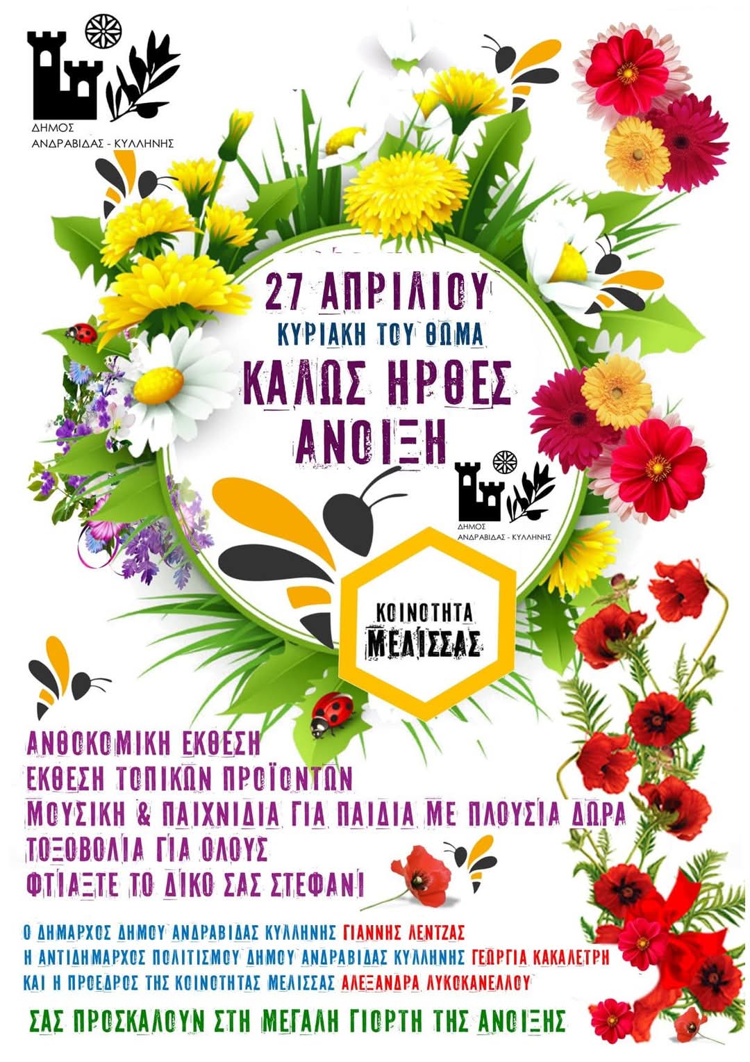 O Δήμαρχος Δήμου Ανδραβίδας – Κυλλήνης Γιάννης Λέντζας, η Αντιδήμαρχος Πολιτισμού Δήμου Ανδραβίδας – Κυλλήνης Γεωργία Κακαλέτρη και η Πρόεδρος της Κοινότητας Μέλισσας Αλεξάνδρα Λυκοκανέλλου, σας προσκαλούν στη μεγάλη γιορτή της άνοιξης!