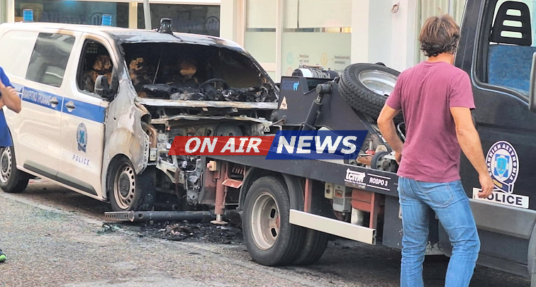 Το όχημα της Τροχαίας (τύπου βαν) που βλέπετε στη φωτογραφία του onairnews.gr τυλίχθηκε στις φλόγες με αποτέλεσμα το μπροστινό του τμήμα να υποστεί σοβαρές ζημιές.
