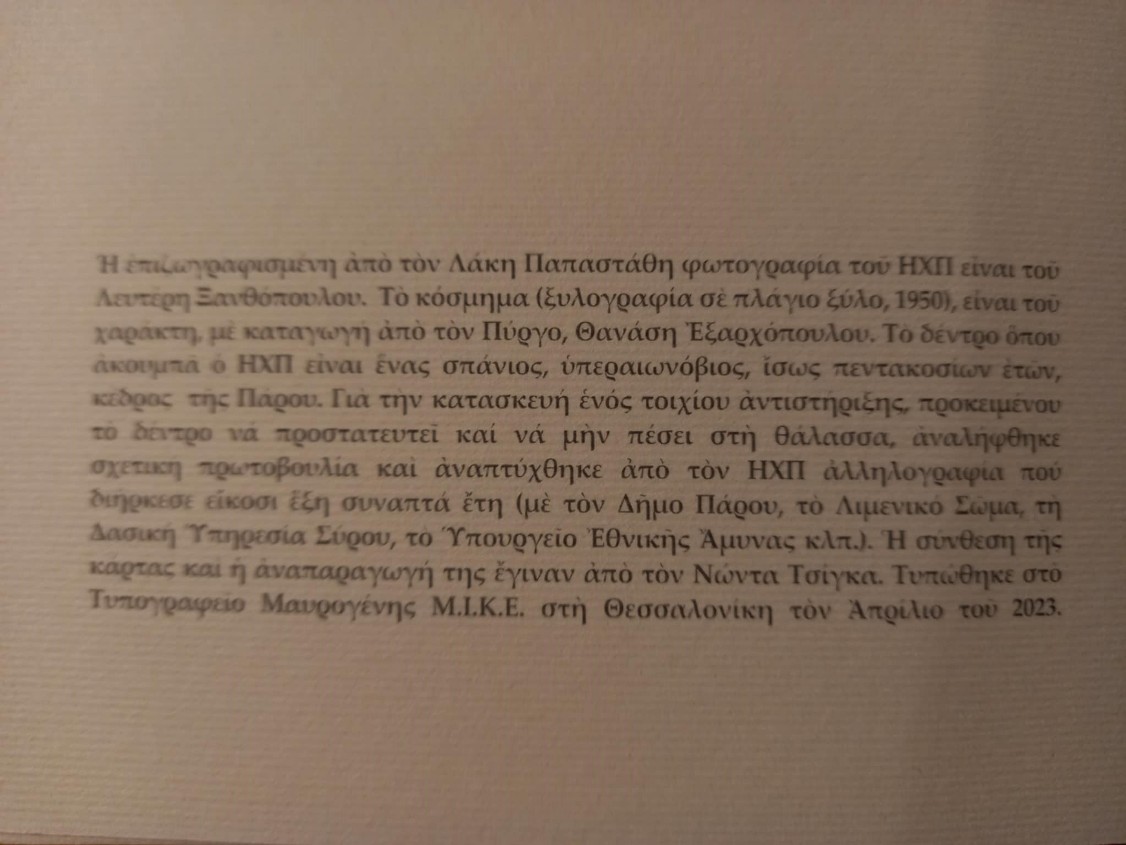 «Η επιζωγραφισμένη από τον Λάκη Παπαστάθη φωτογραφία του Η.Χ.Π. είναι του Λευτέρη Ξανθόπουλου. Το κόσμημα (ξυλογραφία σε πλάγιο ξύλο, 1950), είναι του χαράκτη με καταγωγή από τον Πύργο, Θανάση Εξαρχόπουλου. Το δέντρο όπου ακουμπά ο Η.Χ.Π. είναι ένας σπάνιος, υπεραιωνόβιος, ίσως πεντακοσίων ετών, κέδρος της Πάρου. Για την κατασκευή ενός τοιχίου αντιστήριξης, προκειμένου το δέντρο να προστατευθεί και να μην πέσει στη θάλασσα, αναλήφθηκε σχετική πρωτοβουλία και αναπτύχθηκε από τον Η.Χ.Π. αλληλογραφία που διήρκεσε είκοσι έξη συναπτά έτη (με τον Δήμο Πάρου, το Λιμενικό Σώμα, τη Δασική Υπηρεσία Σύρου, το Υπουργείο Εθνικής Άμυνας  κλπ). Η σύνθεση της κάρτας και η αναπαραγωγή της έγιναν από τον ΝώνταΤσίγκα. Τυπώθηκε στο Τυπογραφείο Μαυρογένης Μ.Ι.Κ.Ε. στη Θεσσαλονίκη τον Απρίλιο του 2023.»