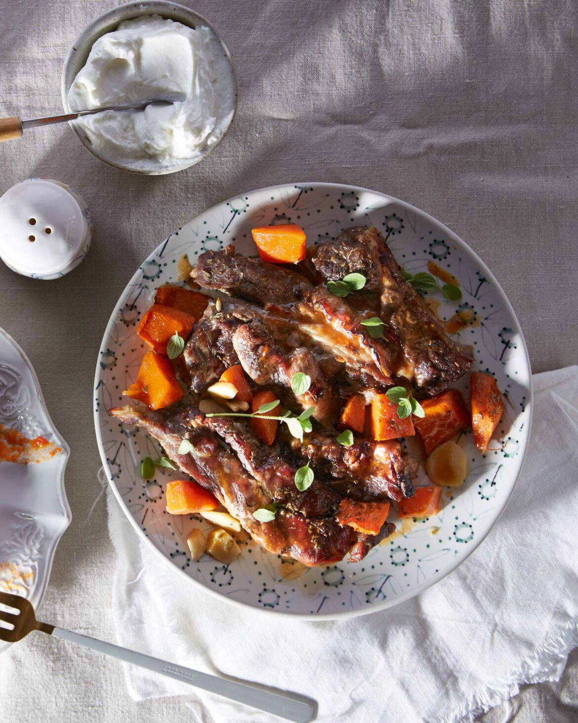- Τακτοποιούμε ομοιόμορφα τα κυβάκια κολοκύθας ανάμεσα στα μπριζολάκια και αλατοπιπερώνουμε.