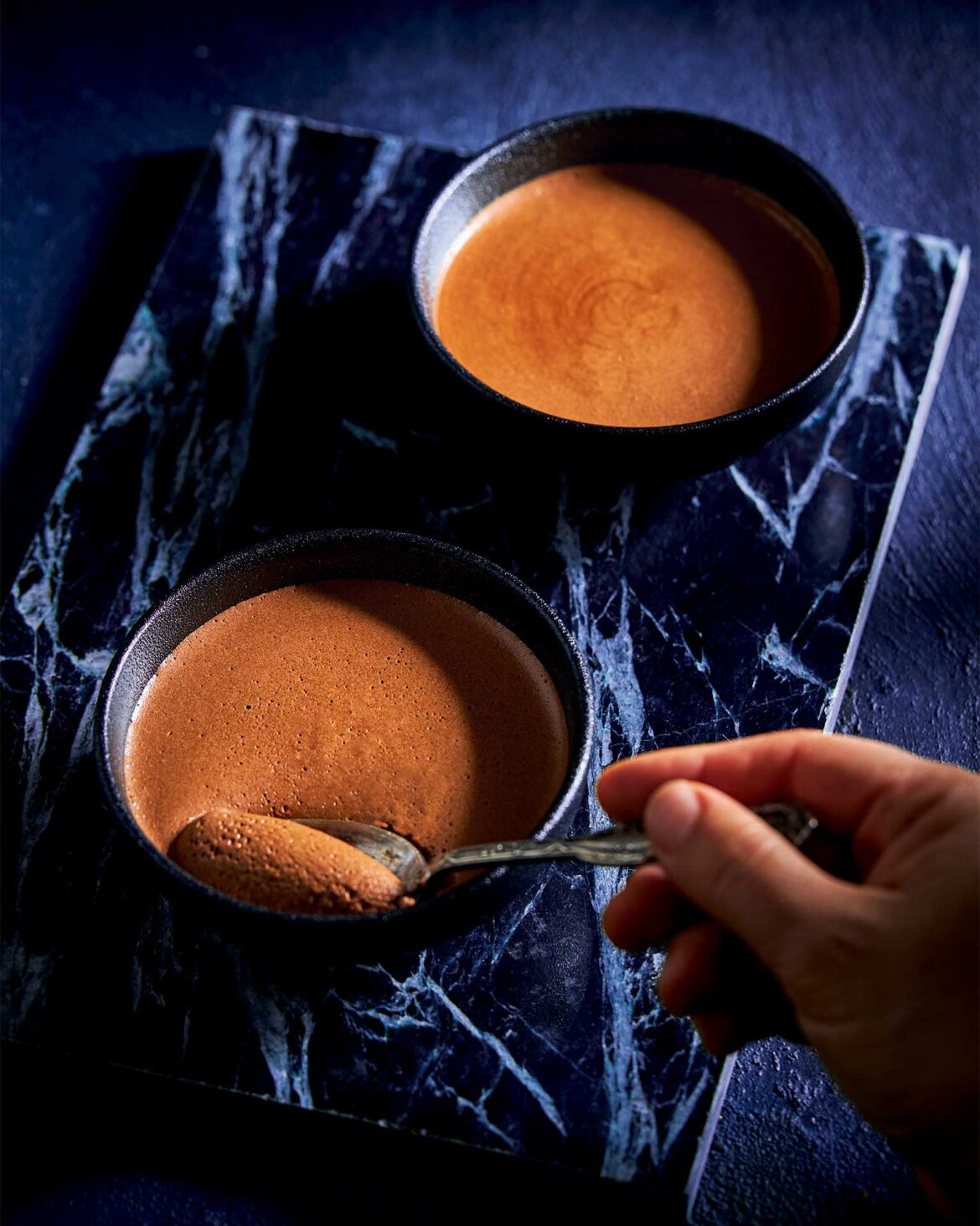 - Για τη βελούδινη μους σοκολάτας, ξεκινάμε και ψιλοκόβουμε την κουβερτούρα και τη βάζουμε σε ένα μπολ.