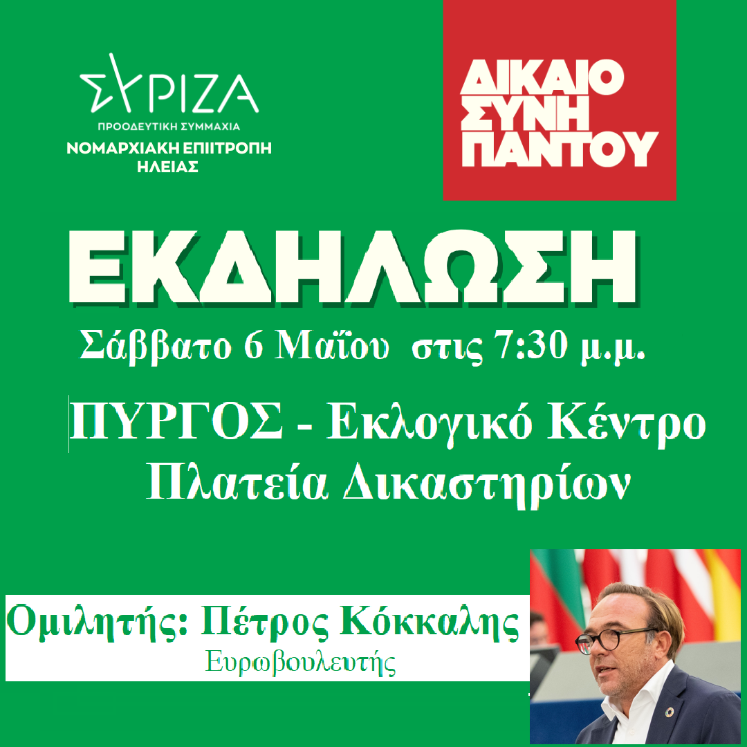 Θα μιλήσει ο Πέτρος Κόκκαλης, Ευρωβουλευτής του ΣΥΡΙΖΑ – ΠΣ