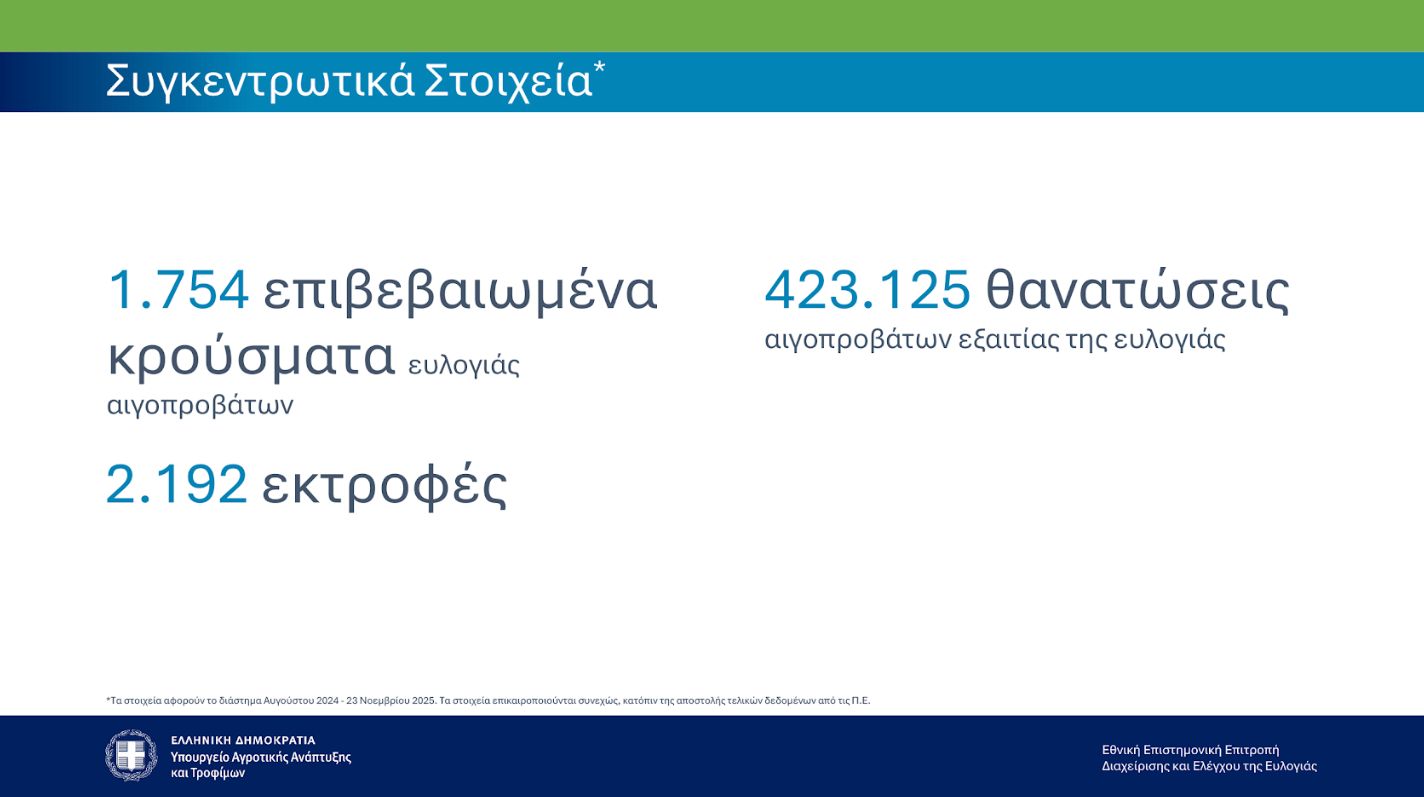 Περισσότερα από 423 χιλιάδες ζώα έχουν θανατωθεί από τον Αύγουστο του 2024 έως και τις 23 Νοεμβρίου του 2025, στο πλαίσιο εφαρμογής των προβλεπόμενων υγειονομικών πρωτοκόλλων, για την αντιμετώπιση της ευλογιάς των αιγοπροβάτων, σύμφωνα με επικαιροποιημένα στοιχεία του υπουργείου Αγροτικής Ανάπτυξης και Τροφίμων και της Εθνικής Επιστημονικής Επιτροπής Διαχείρισης και Ελέγχου (ΕΕΕΔΕΕ) της ευλογιάς των αιγοπροβάτων.