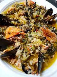 Σε μια κατσαρόλα σοτάρουμε τα κρεμμύδια και το πράσο με το ελαιόλαδο για μερικά λεπτά, προσθέτουμε από τα θαλασσινά μόνο τις σουπιές και τα καλαμάρια και συνεχίζουμε το σοτάρισμα για μερικά λεπτά ακόμη.