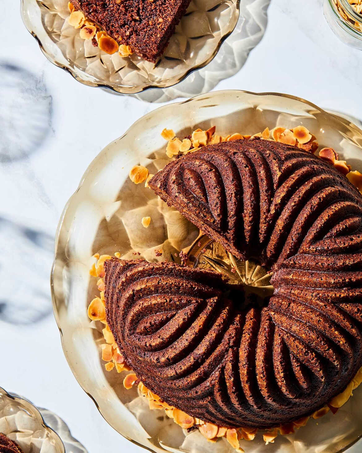 - Αδειάζουμε το μείγμα, ισιώνουμε την επιφάνεια και γαρνίρουμε όλη την επιφάνεια με το αμύγδαλο φιλέ.