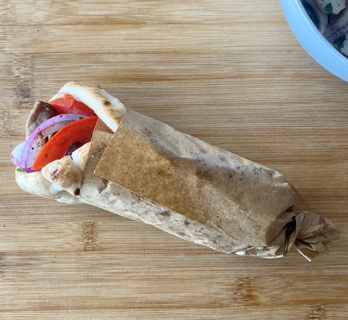 Τυλίγουμε κάθε σουβλάκι σφιχτά (μπορούμε και με λαδόκολλα, ώστε να στέκεται καλύτερα), αν θέλουμε συμπληρώνουμε επιπλέον αλάτι/πάπρικα από πάνω και σερβίρουμε αμέσως.