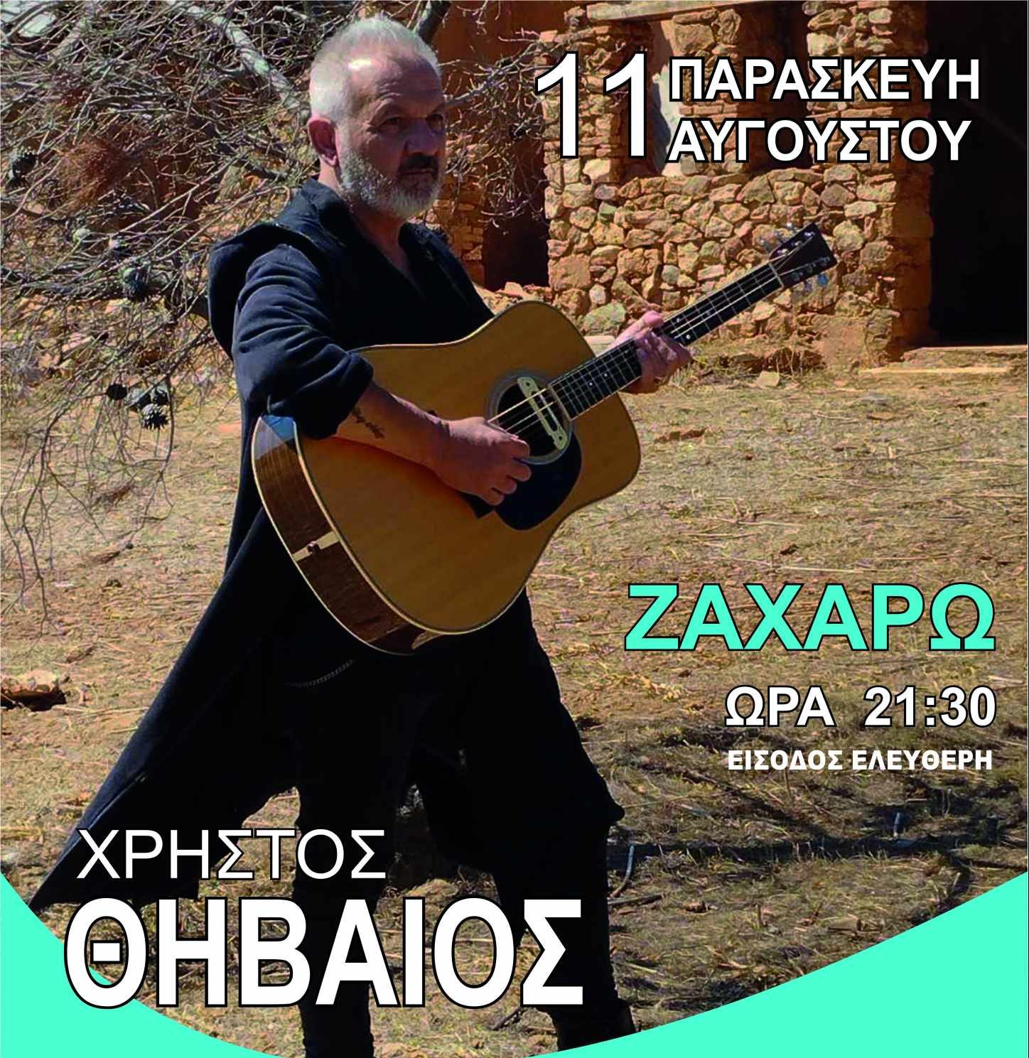 Ένα υπέροχο μουσικό ταξίδι, θα χαρίσει στον κόσμο της Ζαχάρως και της ευρύτερης περιοχής το βράδυ της Παρασκευής 11 Αυγούστου, ο αγαπημένος τραγουδοποιός και ερμηνευτής Χρήστος Θηβαίος, στις 9.30 το βράδυ στην πλατεία της Ζαχάρως. Τη συναυλία διοργανώνει ο τομέας Πολιτισμού της Περιφέρειας Δυτικής Ελλάδας με ελεύθερη είσοδο για το κοινό, ενταγμένη στη Φλόγα Πολιτισμού 2023.