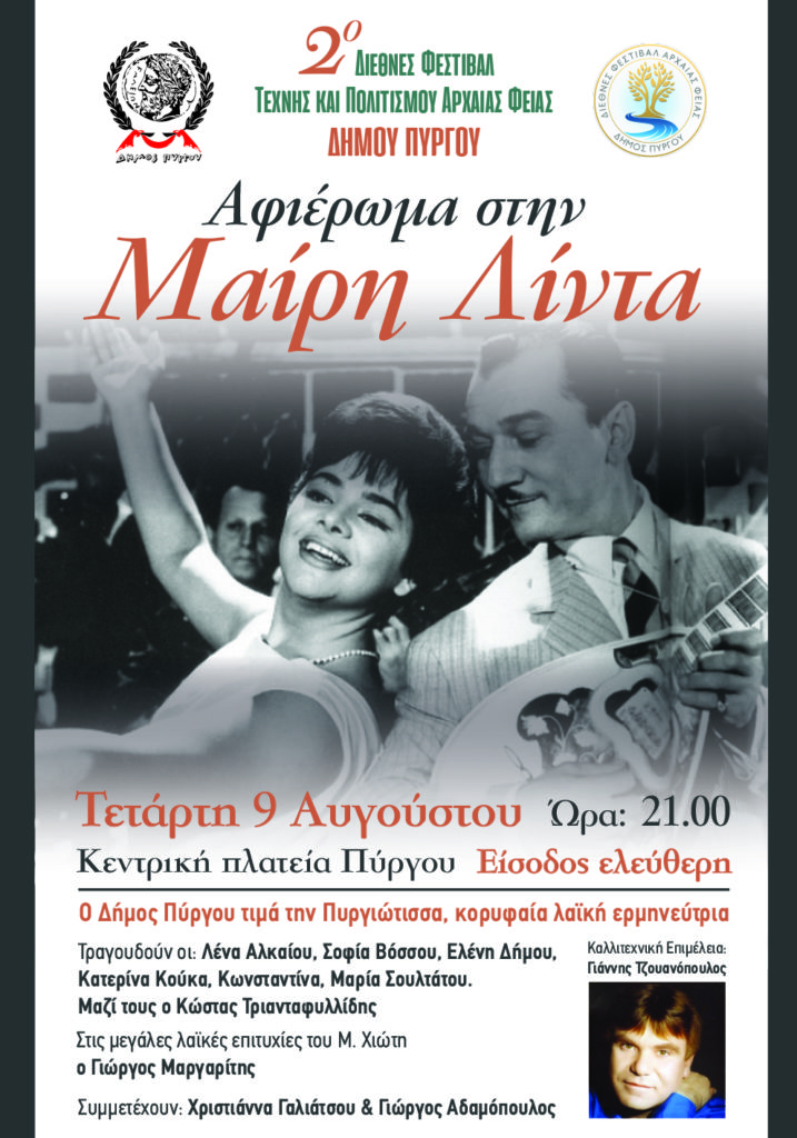 Στην τελική ευθεία βρίσκονται όλες οι ετοιμασίες για την μεγαλύτερη καλλιτεχνική εκδήλωση του καλοκαιριού. Ο Δήμος Πύργου, για πρώτη φορά τιμά την κορυφαία λαϊκή ερμηνεύτρια, την «δική» μας Μαίρη Λίντα, με μια συναυλία-αφιέρωμα με τη συμμετοχή γνωστών και καταξιωμένων τραγουδιστών.