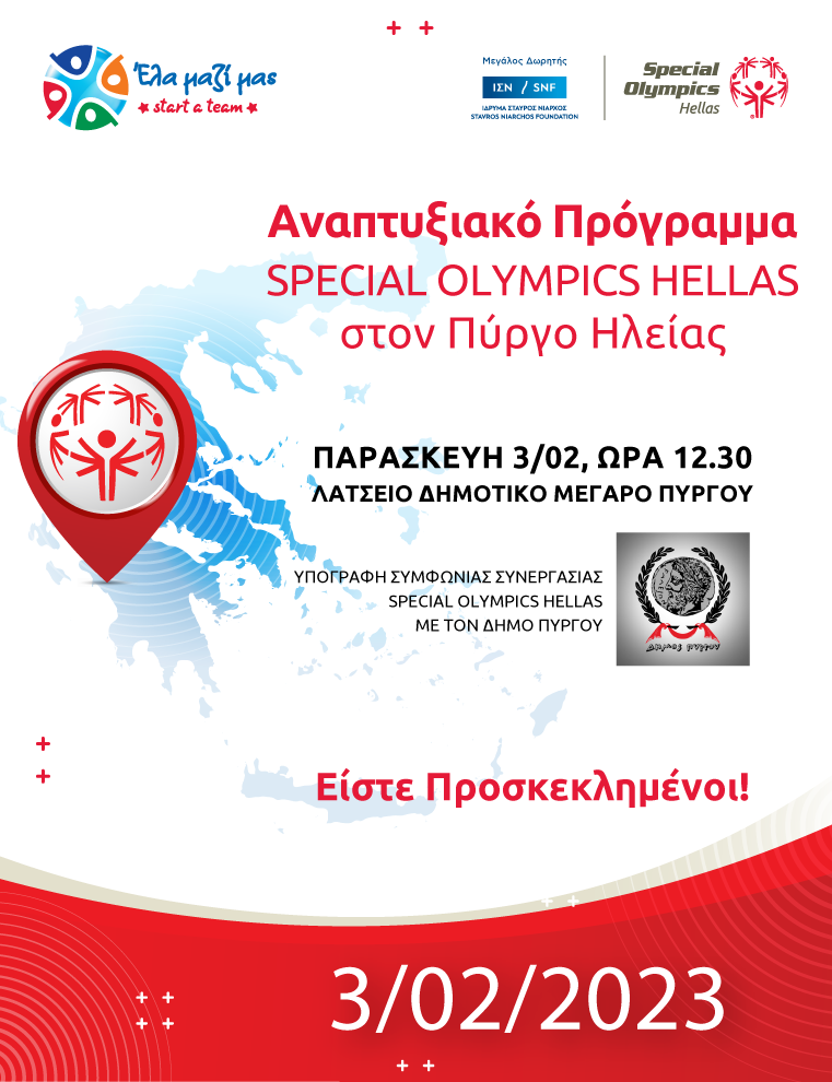 Ο Πύργος γίνεται η 17η πόλη της Ελλάδας στην οποία θα υλοποιηθεί το Αναπτυξιακό Πρόγραμμα των Special Olympics Hellas, το οποίο θα επισφραγιστεί με την υπογραφή Συμφωνίας μεταξύ του Προέδρου των Special Olympics Hellas, Πρέσβυ ε.τ. Διονύσιου Κοδέλλα και του Δημάρχου Πύργου Παναγιώτη Αντωνακόπουλου.