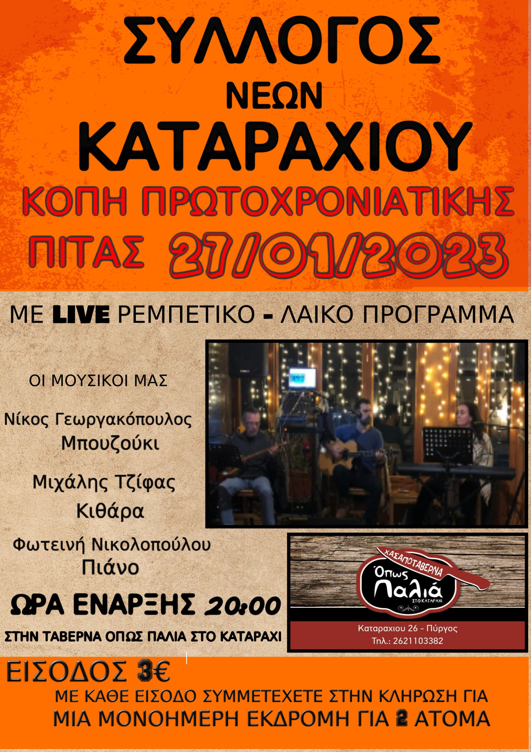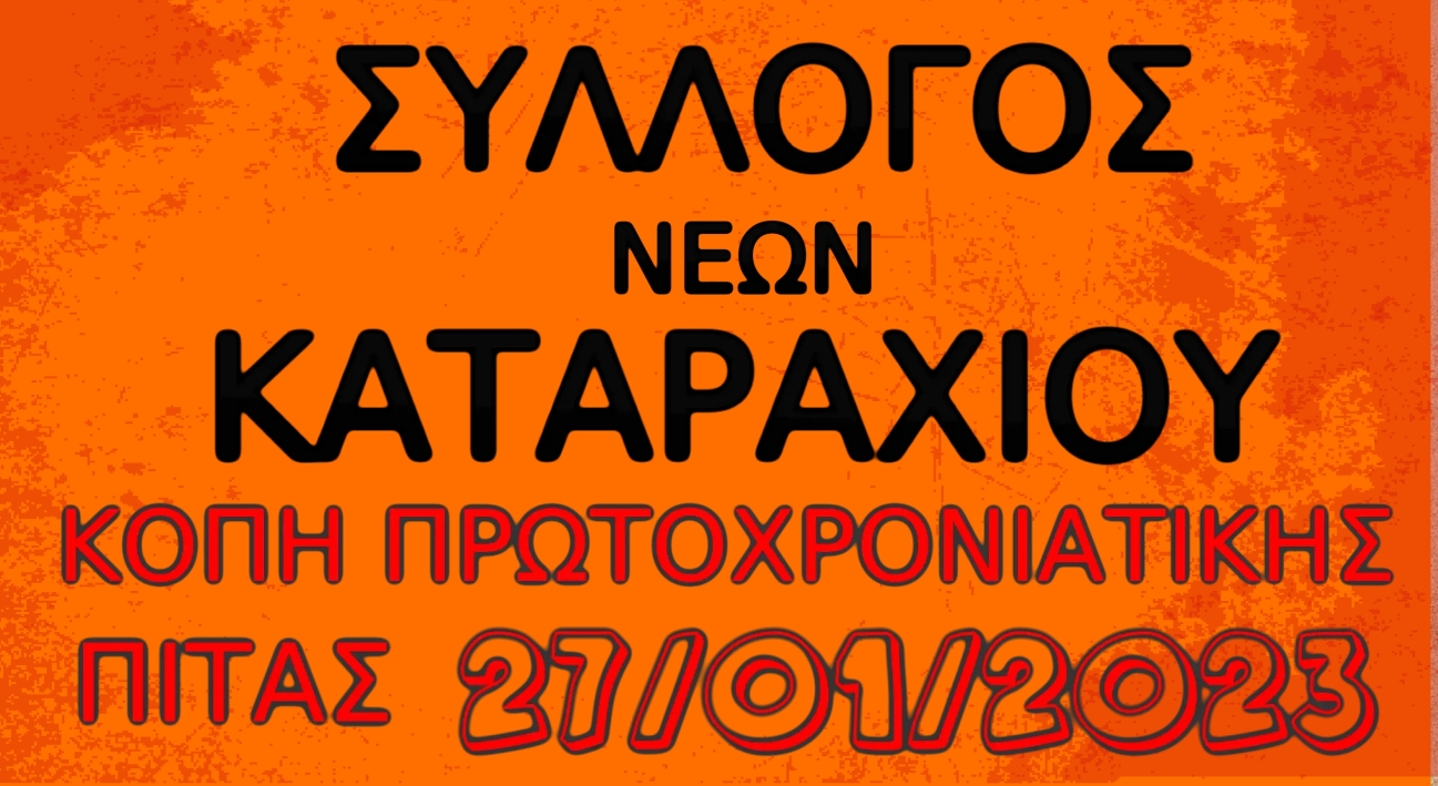 Ο Σύλλογος Νέων Καταραχίου Πύργου σας προσκαλεί στην κοπή της πρωτοχρονιάτικης βασιλόπιτας 2023