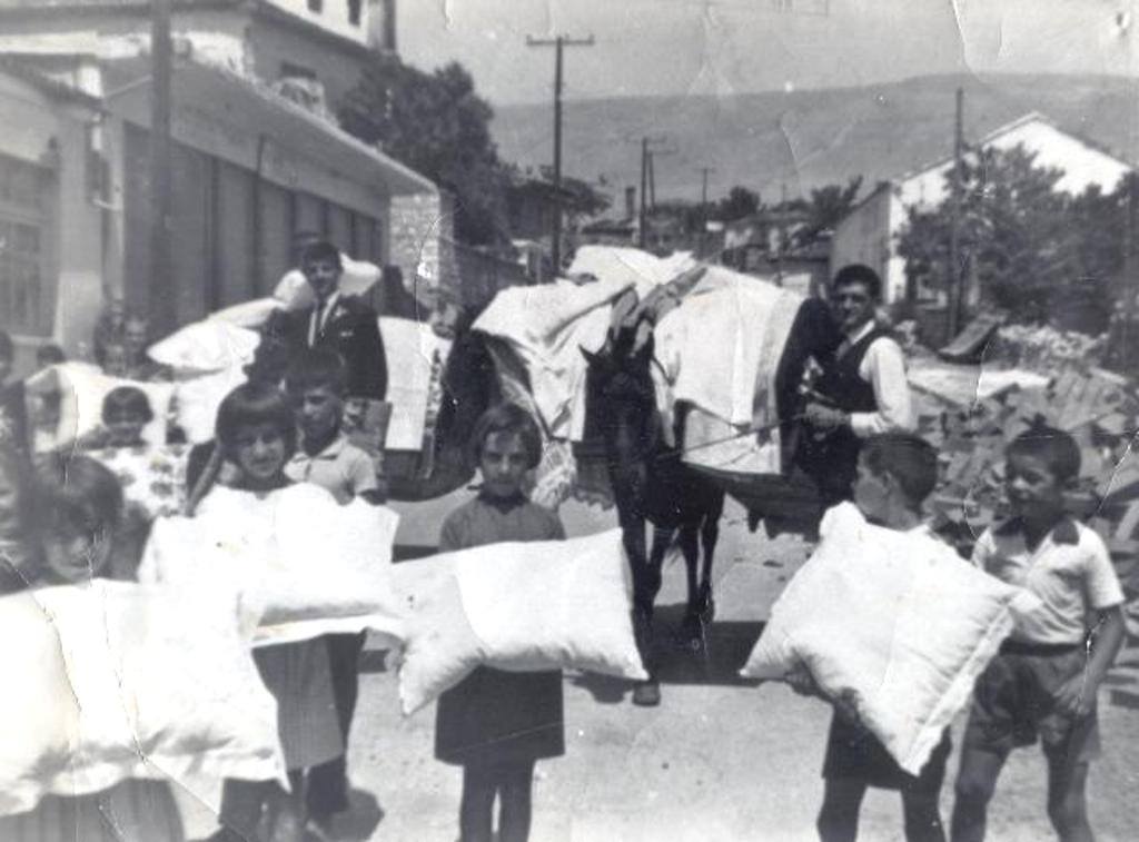 Μπροστά πήγαιναν τρία παιδιά με λευκά μαντήλια στο λαιμό, που είχαν από ένα μαξιλάρι της φιγούρας στο κεφάλι τους κι από ένα κάνιστρο (μεγάλο καλάθι). Το πρώτο κάνιστρο είχε τα γλυκά και το ποτό, το δεύτερο είχε την αλλαξιά του γαμπρού (πετσέτα, μαντήλι, πιτζάμες, εσώρουχα κλπ) και το τρίτο υφαντά υφάσματα για μεσοφόρια και φουστάνια, δώρα της νύφης στον πεθερό και στην πεθερά.