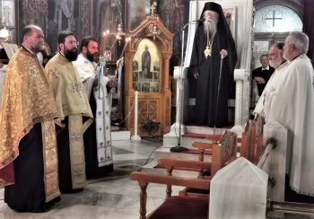 Την Δευτέρα 19η Οκτωβρίου 2020 παραμονή της εορτής, έλαβε χώρα ο Μέγας Αρχιερατικός Πανηγυρικός Εσπερινός μετ’ αρτοκλασιών και Θείου Κηρύγματος χοροστατούντος του Σεβασμιωτάτου Μητροπολίτου μας κ.κ. Γερμανού, ο οποίος κήρυξε επίκαιρα και τον Θείον Λόγον, πλαισιούμενος υπό του Πανοσιολογιοτάτου Αρχιμανδρίτου και Ιεροκήρυκος της Ιεράς Μητροπόλεώς μας π. Φιλαρέτου Σπανοπούλου, καθώς επίσης από τους Αιδεσ. π. Ηλία Κουμπαρούλη, π. Κωνσταντίνο Θεοδωρόπουλο, π. Νικόλαο Κατσηδήμα, π. Νικόλαο Γιαννακόπουλο και τον προϊστάμενο του ναού π. Γεώργιο Χαρδαβέλα. Ωστόσο, λόγω των περιοριστικών μέτρων εξαιτίας του Covid-19, δεν πραγματοποιήθηκε η λιτανεία της ιερής εικόνας εκτός της εκκλησίας. Την Τρίτη 20η Οκτωβρίου, κυρία ημέρα της εορτής τελέσθηκε η ακολουθία του Όρθρου μετ’ αρτοκλασιών και εν συνεχεία η Πανηγυρική Θεία Λειτουργία, υπό των Αιδεσ. π. Γεωργίου Χαρδαβέλα και π. Κωνσταντίνου Θεοδωρόπουλου.